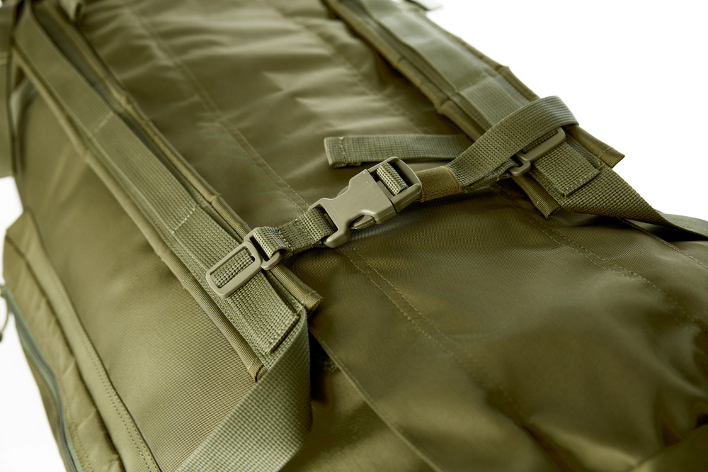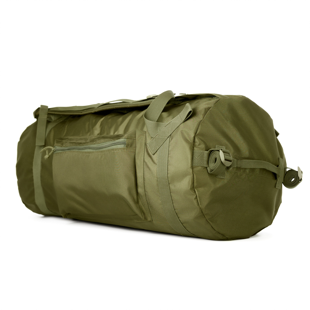 Ця модель застібається на блискавку, прикриту клапаном на велкролипучці, що надійно захищає вміст від забруднень. Для максимальної зручності та рівномірного розподілу навантаження виробник передбачив широкі плечові лямки, завдяки яким баул можна носити як рюкзак на спині. Також є спеціальні ручки для транспортування баула у руках. Збоку розташований прозорий відсік із двома кишенями, в які можна розмістити знаки розрізнення або інші дрібні речі, які мають бути у швидкому доступі. Додаткові бічні ручки дозволяють зручно переносити баул у вертикальному положенні.