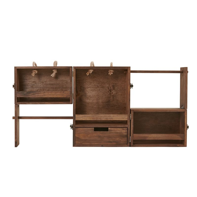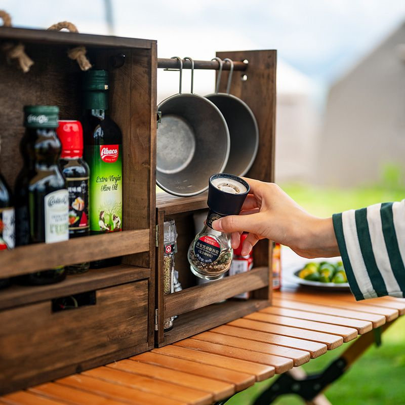 Красива і стильна етажерка Naturehike CNH22JU018 виготовлена із сосни. Вона має 3 полички, призначені для зберігання спецій, а також одну висувну скриньку для зберігання столових приладів. Також у неї є підвісні полиці, на яких можна кріпити посуд або рушники та висувну скриньку для будь-яких дрібниць. Модель швидко і просто складається. Для зручного перенесення у неї передбачені ручки, виготовлені з мотузки, які не впиваються в шкіру навіть за тривалих походів.
