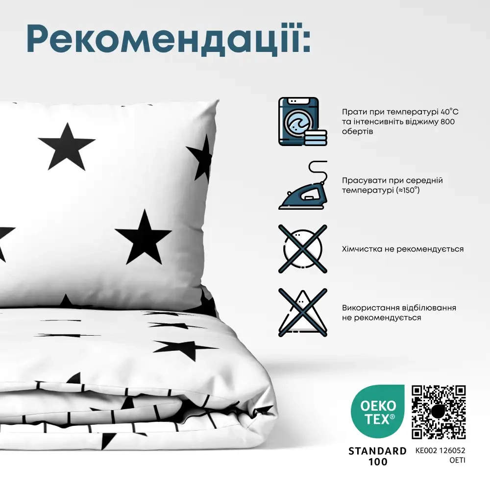 Матеріал та догляд:Щоб постіль довго прослужила, дотримуйтесь рекомендацій: Виперіть постіль перед першим використанням окремо від інших виробів при температурі 30°С. Надалі періть з подібними кольорами при температурі не більше 40°С, без відбілювачів.