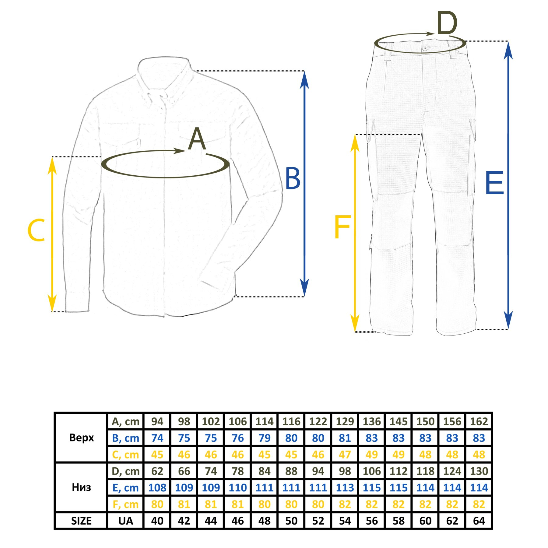 Особливості:- Матеріал: Костюм виготовлений із Rip-Stop матеріалу, який складається з 65% бавовни та 35% поліестеру. Ця комбінація матеріалів забезпечує високу міцність та довговічність.