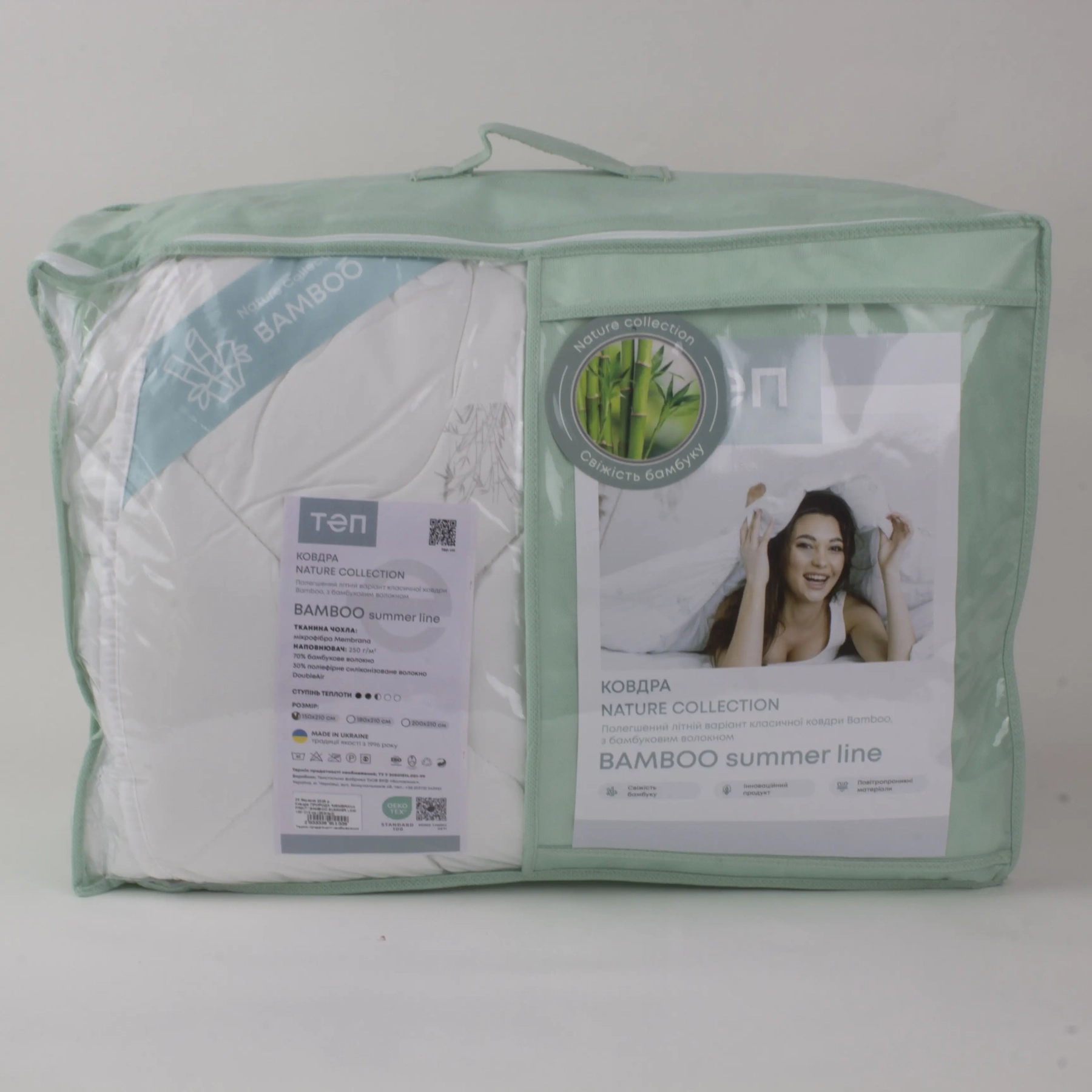 Ковдра "NATURE COLLECTION" BAMBOO SUMMER LINE від ТЕП - це ідеальне рішення для літніх ночей, яке забезпечує незабутній комфорт і здоровий сон. Ця ковдра має унікальні терморегулюючі властивості та використовує спеціальну тканину Membrana, яка утримує повітря всередині та створює повітряний ефект.