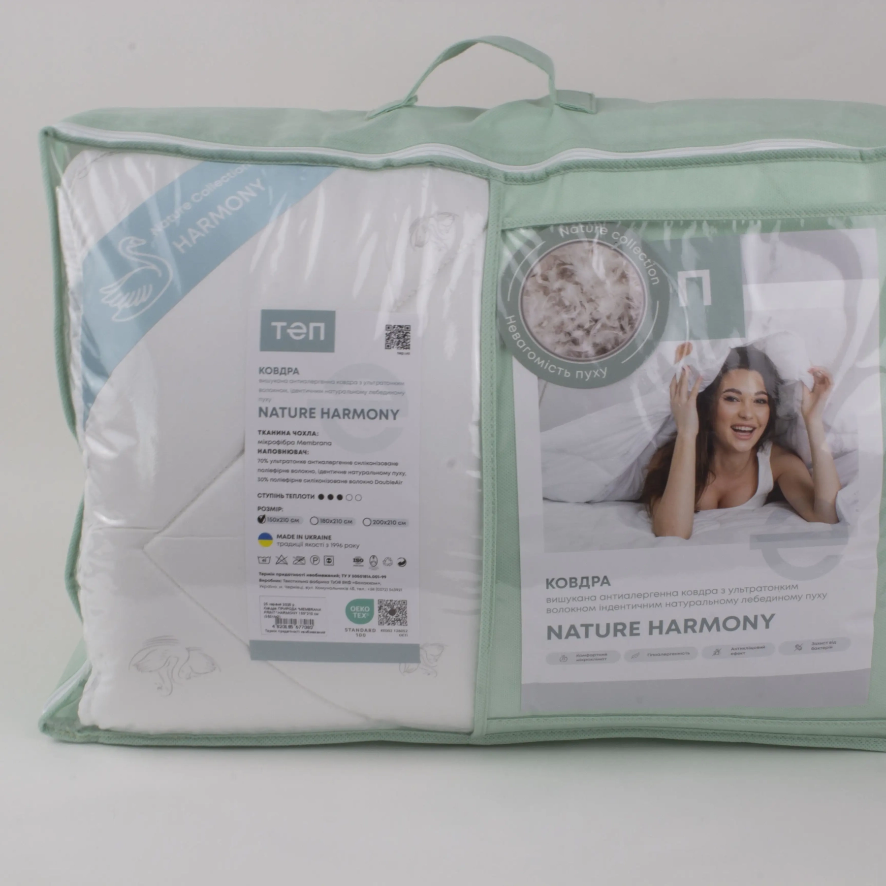 Зовнішня тканина – високотехнологічна мікрофібра Membrana. З внутрішнього боку ця тканина оброблена ультразвуковим коландером, що створює ефект мембрани. Особливість мембрани – пропускати всередину виробу трохи більше повітря, ніж випускати назовні. Так виникає повітряний ефект, який робить ковдри та подушки більш об'ємними, легкими, ніжними. Membrana – це тканина нового покоління, оксамитова, еластична, ніжна і дуже міцна. Натуральне бавовняне волокно м’яке та ніжне, це улюблений традиційний наповнювач в домашньому текстилі. Ковдри з колекції Nature від ТЕП – це сила природного відновлення для здорового комфортного сну.