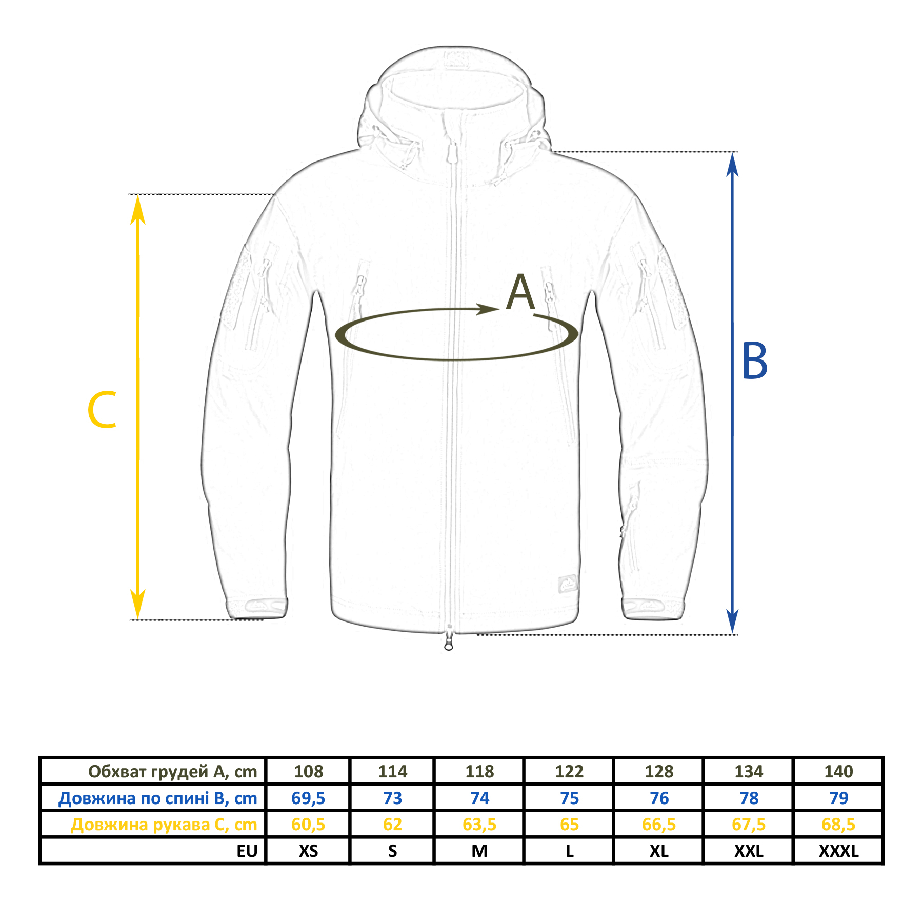 Розмір Обхват грудної клітини (см) Загальна довжина ззаду(см) Довжина рукава (см) Довжина рукава від плеча (см) XS 108 68/78 53 60,5 S 114 69/79 54 62 M 118 70/80 55 63 L 122 71/81 56 65 XL 128 72/82 57 65 XXL 134 73/84 58 67 3XL 140 74/85 59 68,5