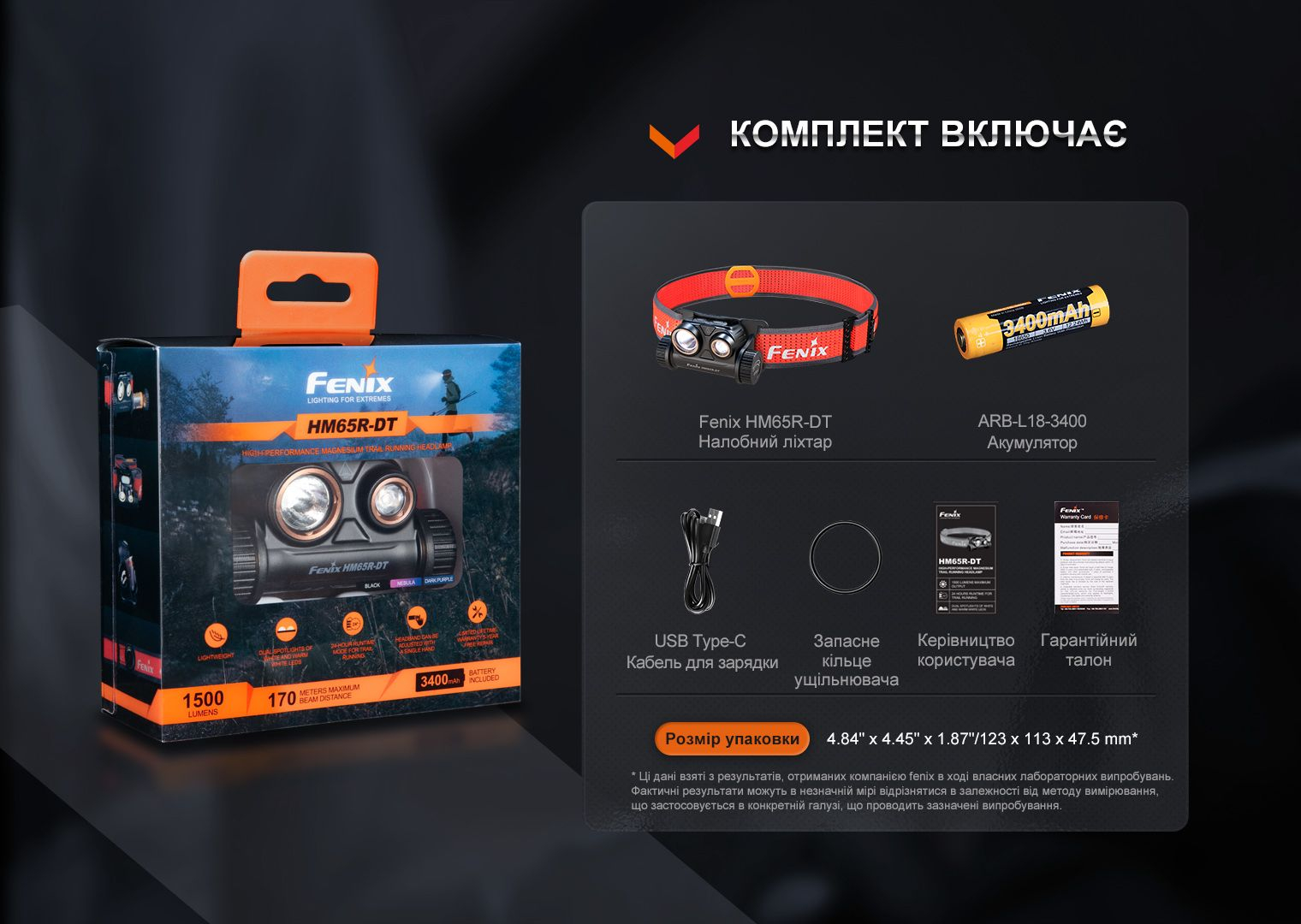 Налобний ліхтар HM65R-DT, акумулятор ARB-L18-3400, кабель для заряджання USB Type-C, запасний ущільнювач, інструкція користувача і талон гарантії.