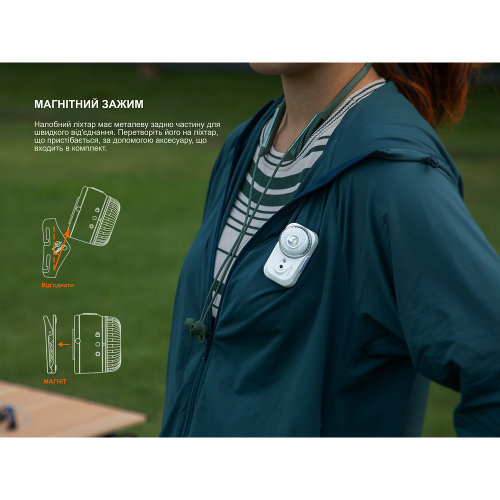 Ви можете використовувати Fenix HL17R як класичний ліхтар на голову із двосекційною резинкою, яка розподіляє тиск та зменшує точкове навантаження на лоб. Пристрій також передбачає кріплення на металевій поверхні за допомогою вбудованого магніту, а задня швидкознімна панель працює як затискач-кліпса для фіксації на одязі.