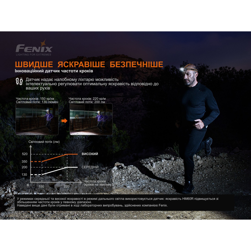 Унікальною фішкою моделі є інтелектуальний сенсор частоти кроку. Ліхтар автоматично регулює яскравість залежно від темпу вашого руху в «Середньому» та «Максимальному» режимах. За стандарт взято темп 150 кроків/хв: при прискоренні до 220 кр/хв яскравість зростає до 150%, а при уповільненні до 80 кр/хв — знижується до 70%. Якщо темп падає, яскравість зменшується поступово з затримкою в 10 секунд, що дозволяє очам адаптуватися до зміни світла.