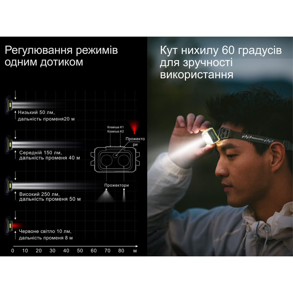 Ключова особливість Naturehike CNK2550ZM011 — безліч способів використання. Ліхтар можна фіксувати на голові за допомогою еластичної резинки. Вам доступна опція налаштування напряму променя: корпус нахиляється на 60° по вертикалі. Дизайн також дозволяє кріпити модель на одязі або на рюкзаку за допомогою знімної кліпси.