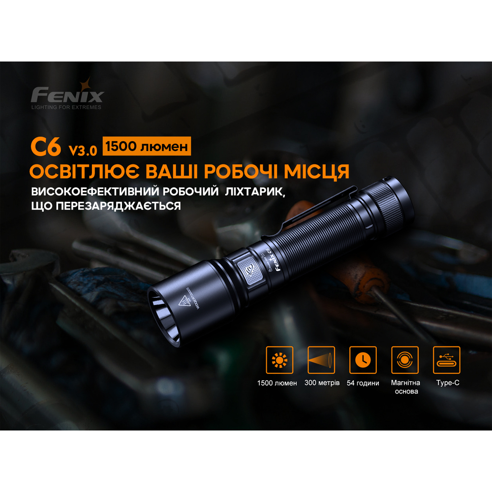 Ручний ліхтар Fenix C6 V3.0 оснащений холодним білим світлодіодом Luminus SST40, який генерує промінь потужністю до 1500 лм та дальністю 300 м. Модель актуальна для професійних цілей, будівництва, активного відпочинку та повсякденних завдань у побуті, коли потрібне яскраве спрямоване світло, швидке заряджання, а в деяких випадках потрібно повністю звільнити руки для виконання специфічних робіт. Для цього в конструкцію вбудовано магніт для фіксації на металі.