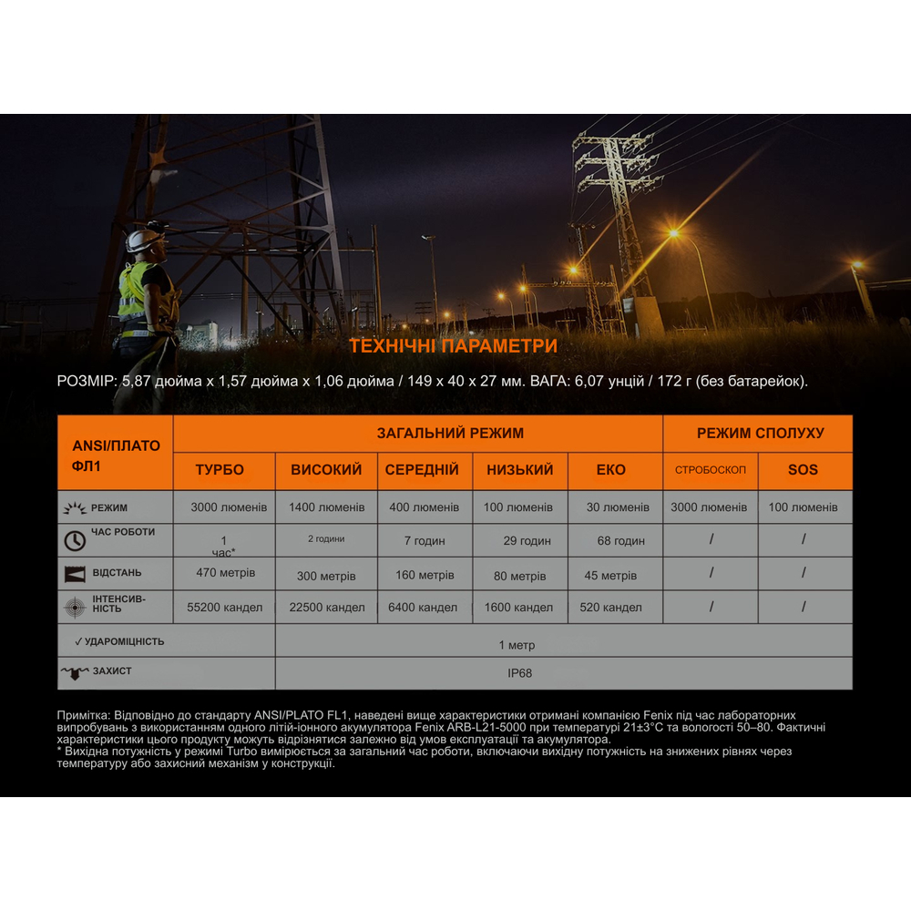 ручний ліхтар Fenix з вбудованим магнітом та знімною кліпсою зі сталі;колір – помаранчевий;тип випромінювачів – 1 х Luminus SST70;max яскравість – 3000 лм;max дальність променя – 470 м;автономність – до 68 год роботи на одному заряді;кількість режимів роботи – 7;метод управління – електронна кнопка;джерело живлення – 1 х 21700 (5000 мА·год);спосіб заряджання – порт USB-C;час повного заряджання – 3 год;матеріал корпусу – алюміній A6061-T6 з твердим анодованим покриттям HAIII;клас герметичності – IP68;удароміцність – 1 м;розміри – 149 x 40 x 27 мм;вага – 172 г (без акумулятора).
