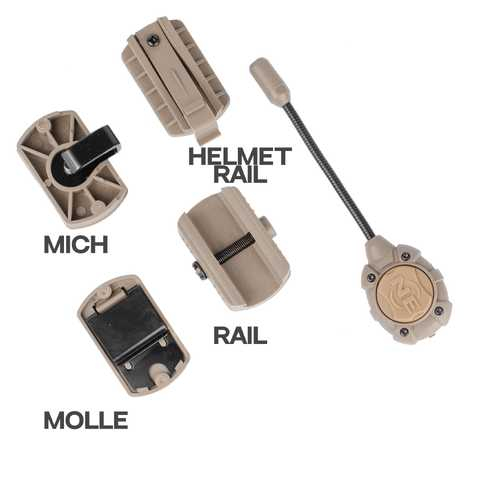 Ліхтар підходить для більшості шоломів типу MICHT, FAST та аналогів. Кріпиться збоку на рейку, або напряму до шолома (в комплекті є кріплення). Також є кріплення на стропи MOLLE/PALS або на зброю.
