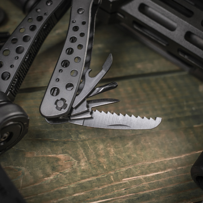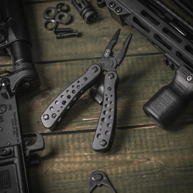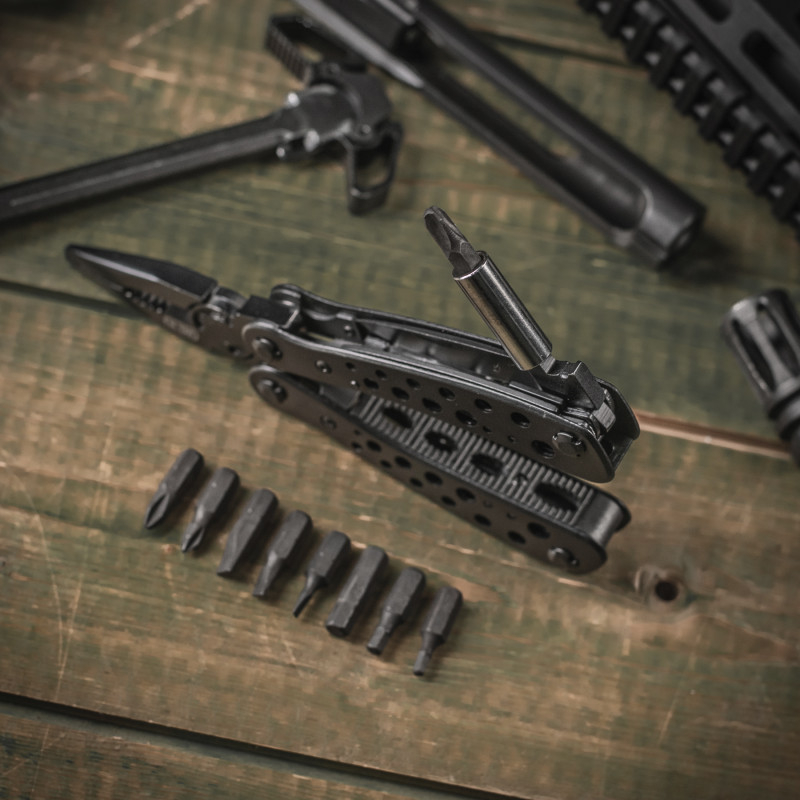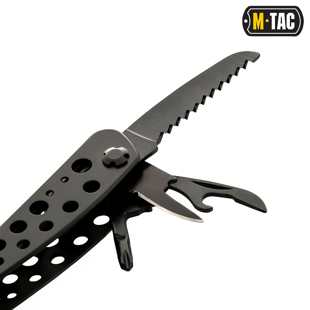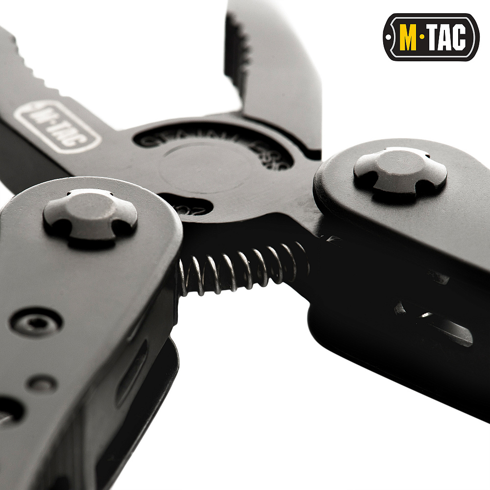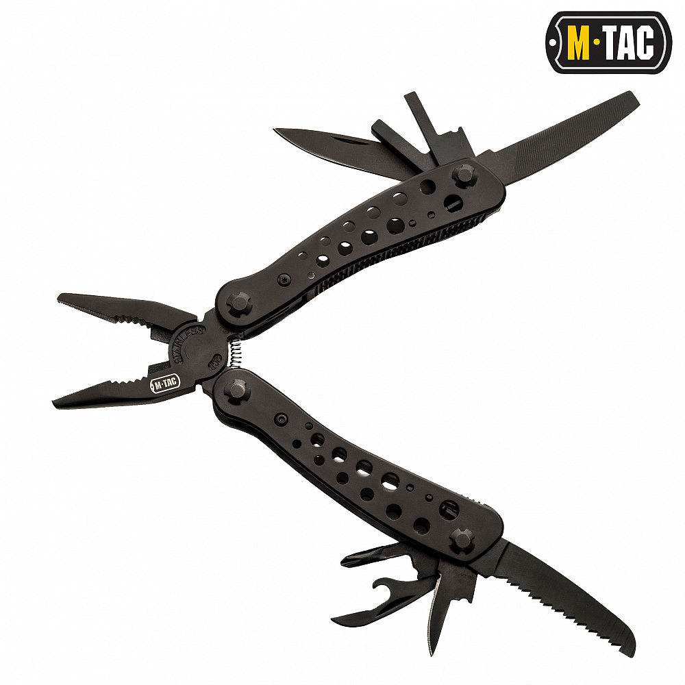 M-TAC МУЛЬТИТУЛ TYPE 1 ЧорнийВиготовлений з нержавіючої сталі 440С марки, що гарантує довговічність та міцність інструментів навіть при довготривалому їх застосуванні. Мультитул TYPE 1 має: ніж, напилок (терпуг), викрутку, бітотримач і 9 насадок різного розміру, шило, консервний ніж і відкривачку для пляшок, хрестову викрутку, пилку та плоскогубці, які розкладаються відведенням рукояток. Всі елементи щільно фіксуються у відкритому та закритому положенні. Завдяки ергономічній формі, мультитул відмінно лежить в руці та не зісковзує під час роботи.