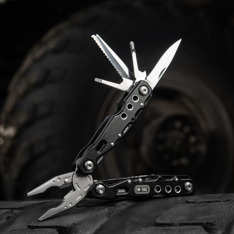Мультитул має багато корисних інструментів: ніж, плоскогубці з пристосуванням для зняття ізоляції, гострогубці, хрестоподібну викрутку, велику плоску викрутку, маленьку плоску викрутку, консервний ніж, відкривачку для пляшок і банок, ножівку, напилок і шило. Всі елементи щільно фіксуються у відкритому та закритому положенні. Завдяки ергономічним формам, мультитул відмінно лежить в руці та не зісковзує під час роботи. На рукоятці нанесено стильний логотип бренду.