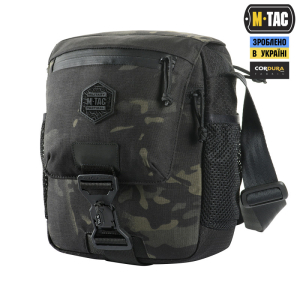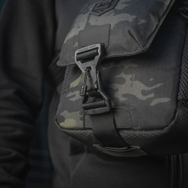 Виготовлена з Cordura Hex і Cordura 500D Multicam Black – надміцних матеріалів, стійких до стирання і механічних навантажень. Блискавки та пряжки від YKK і Woojin – світових лідерів із виробництва фурнітури. Сумка закривається магнітною застібкою Fidlock, яка розроблена в Німеччині та гарантує швидкий доступ до вмісту. Плечовий ремінь з м'якої нейлонової стропи регулюється по довжині.