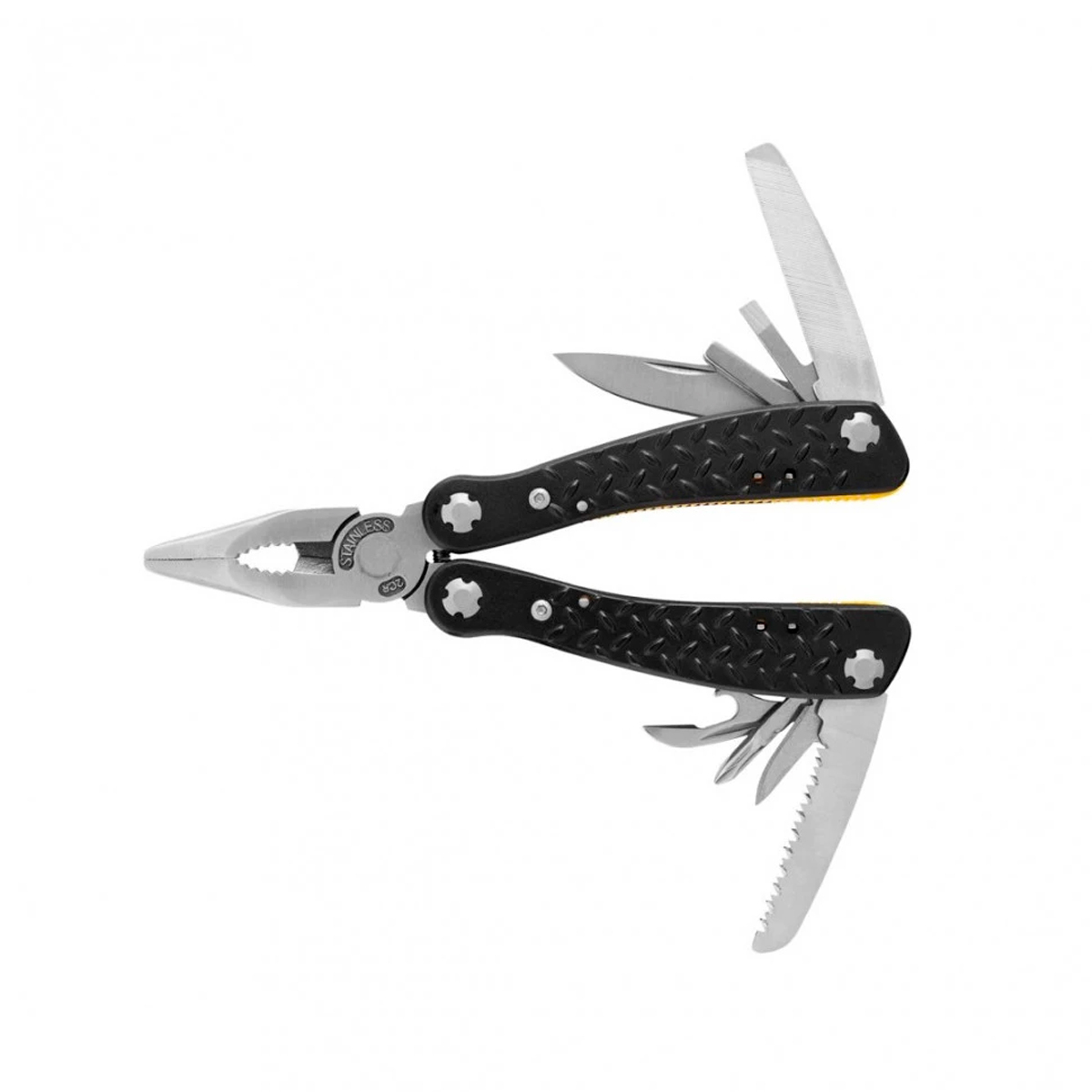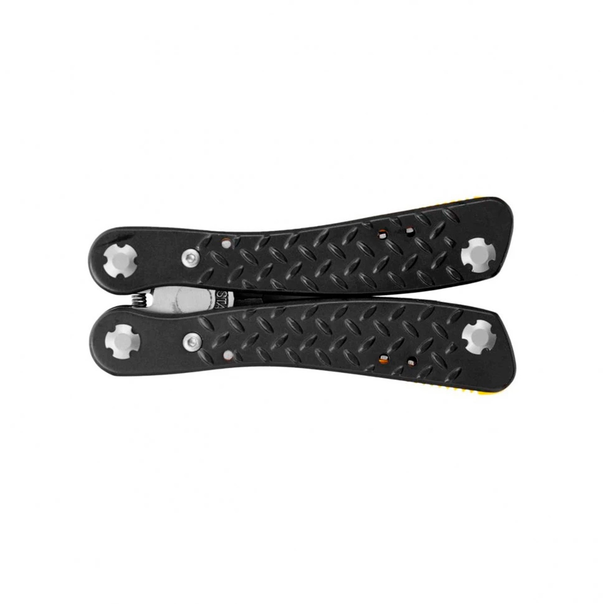- Кількість функцій: 12 (плоскогубці, кусачки, ніж, серрейтор, шило, відкривачка для пляшок і консервів, плоска та хрестоподібна викрутки, напилок, лінійка, набір із 9 біт)