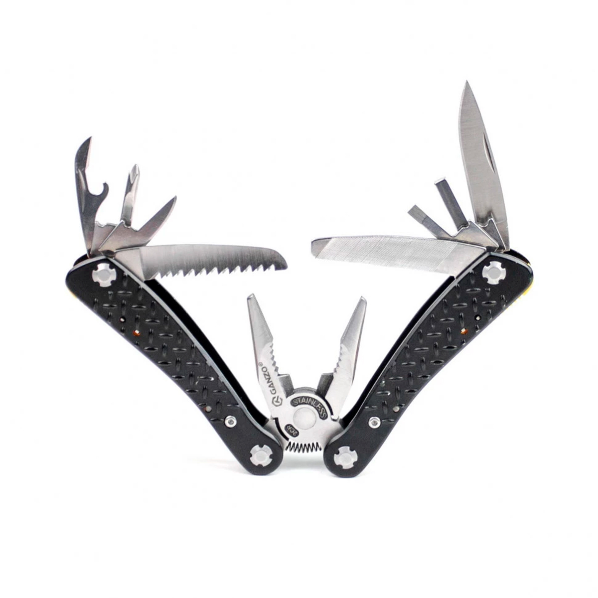 Мультитул Ganzo G106 від китайського бренду Ganzo – це повнорозмірний, але легкий інструмент, призначений для виконання широкого спектра ремонтних робіт у походах, на риболовлі, полюванні чи в побуті. Завдяки вазі 278,6 г і довжині в складеному вигляді 10,5 см він зручний для транспортування. Основу мультитула складають міцні плоскогубці з нержавіючої сталі 440C (твердість 54–57 HRC) з інтегрованими кусачками та ребристим захватом для гайок і круглих предметів. У двох порожнистих алюмінієвих рукоятках із чорним покриттям розміщені додаткові інструменти: ніж із гладким лезом, серрейторний ніж, шило, відкривачка для пляшок і консервів, плоска та хрестоподібна викрутки, напилок, лінійка. У комплекті йде набір із 9 біт (включаючи шестигранники та викрутки) із магнітним перехідником, що розширює функціонал. Мультитул комплектується міцним нейлоновим чохлом для зручного зберігання та носіння на поясі. Ідеально підходить для туристів, рибалок, мисливців і повсякденного використання.