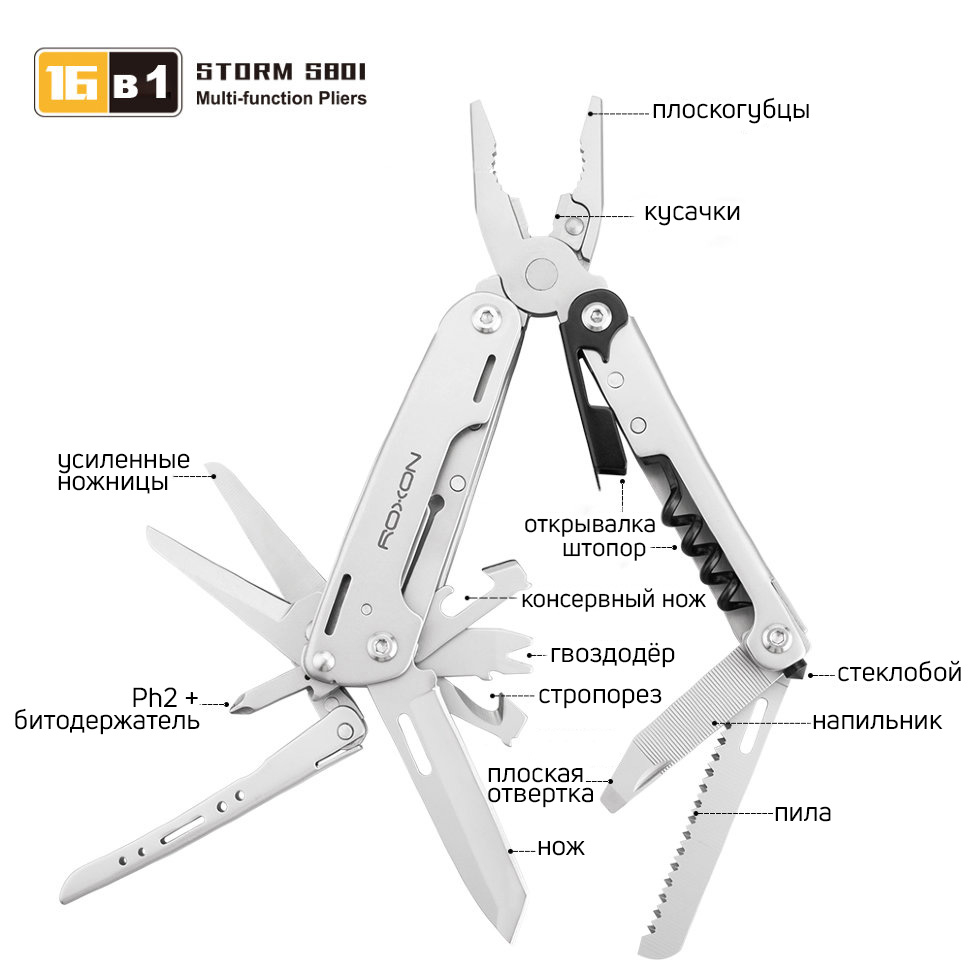 Модель Roxon STORM S801S створена за принципом класичних мультитула. Роль головного інструменту в ньому виконують плоскогубці. Вони додатково оснащені захопленням для круглих предметів і функцією кусачок. Всі інші інструменти розміщуються всередині двох металевих ручок. В тому числі, користувачам доступні пила, невеликий напилок, край якого використовується як пряма викрутка, відкривачка і штопор, склобій. Всі перераховані інструменти знаходяться в одній рукоятці, а в іншій розміщені ніж з гладко заточеним лезом, стропоріз, консервний ніж, шило, посилені ножиці, лінійка, тримач для біт, який виступає також у якості хрестоподібної викрутки.