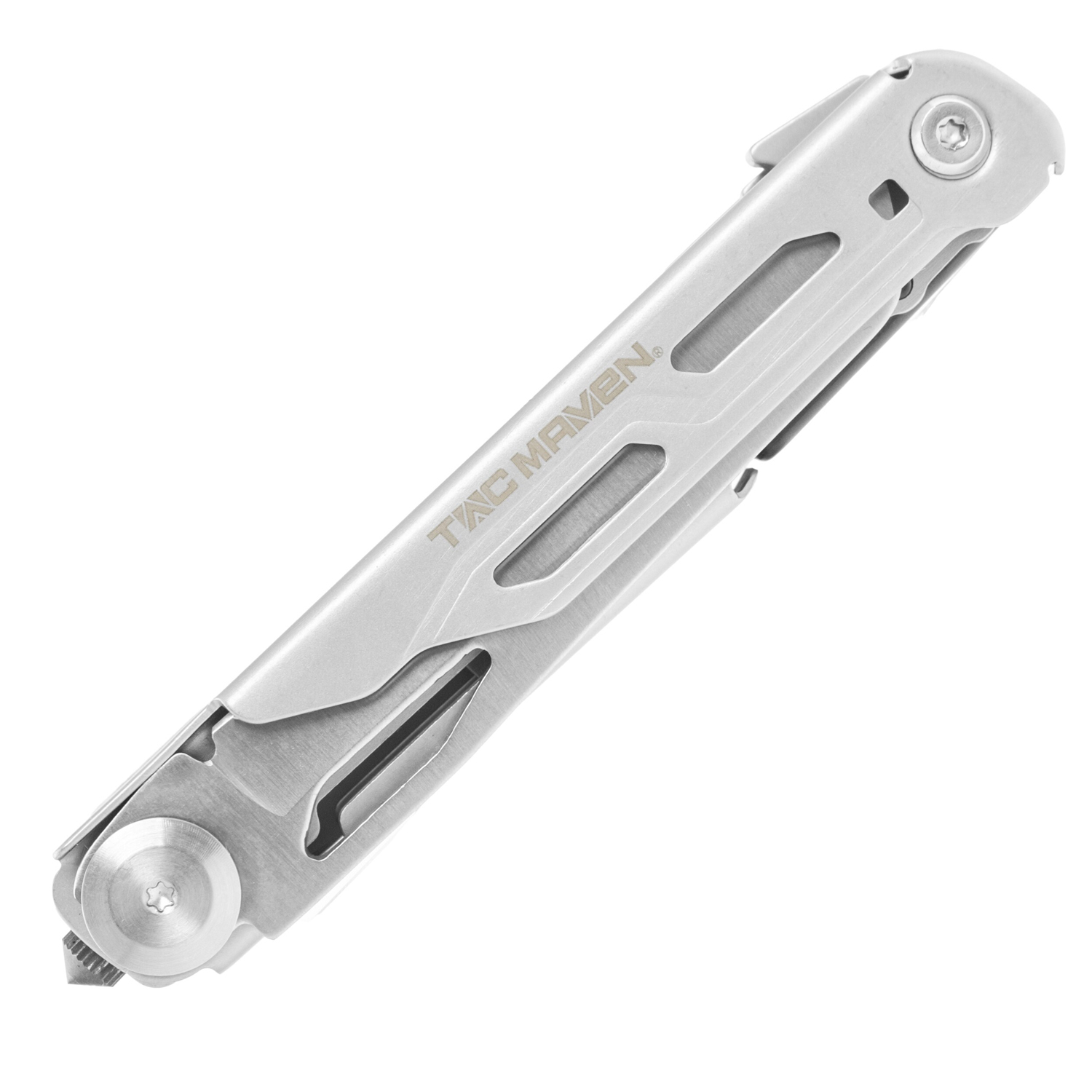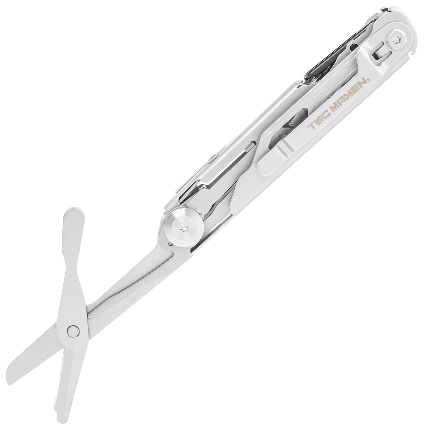 Мультитул Tac Maven Axel Camping – це компактний і універсальний інструмент від бренду Tac Maven, створеного компанією Pentagon. Розроблений для кемпінгу, туризму, риболовлі, полювання та повсякденного використання. Виготовлений із високоякісної нержавіючої сталі: лезо та ножиці з 440 сталі, інші компоненти та руків’я – з 420 сталі, що забезпечує міцність і стійкість до корозії. Мультитул має 5 функцій: лезо, ножиці, плоска та хрестова викрутки, відкривачка для консервів, кишеньовий затискач і склобій. Компактні розміри (11.2 x 2 x 2.5 см) і вага (129 г) роблять його зручним для носіння.
