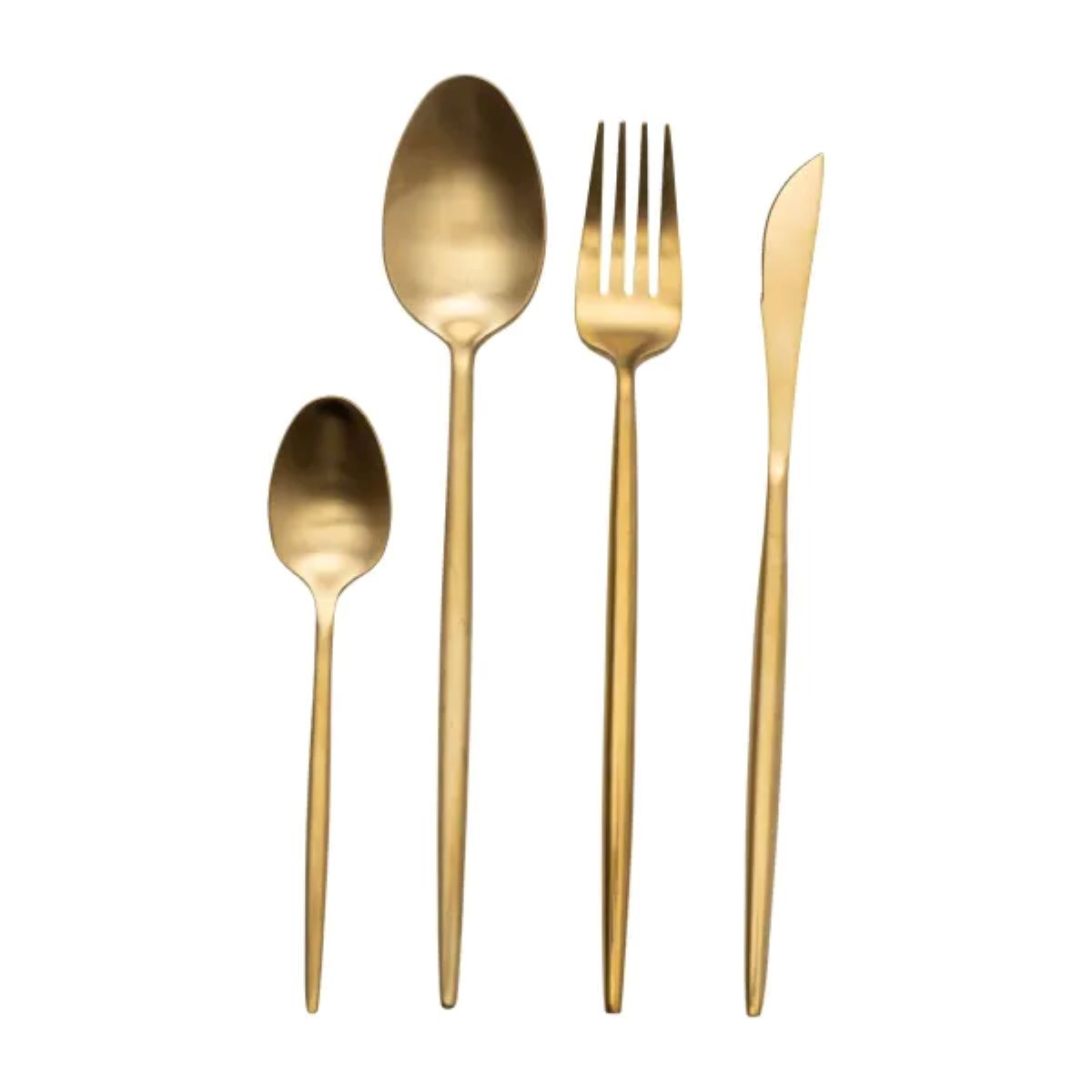 Набір столових приборів золотистого кольору складається з 24 предметів: 6 столових ложок, 6 чайних ложок, 6 виделок і 6 столових ножів. Кожен предмет має класичний дизайн без зайвих декоративних елементів, що робить їх універсальними для щоденного використання або сервірування святкового столу. Столові прибори мають гладку поліровану поверхню, яка легко очищається і не затримує забруднення. Основні характеристики: Кількість предметів у наборі: 24 шт; Кількість персон: 6; Матеріал: нержавіюча сталь; Упаковка: коробка; Розміри приладів: довжина столового ножа: 21.5 см; довжина столової ложки: 22.5 см; довжина столової виделки: 22 см; довжина чайної ложки: 14.5 см. Комплектація набору: столовий ніж: 6 шт; столова ложка: 6 шт; столова виделка: 6 шт; чайна ложка: 6 шт. Матеріал виготовлення - нержавіюча сталь, яка вирізняється міцністю, стійкістю до корозії та довговічністю. Леза ножів мають заточену кромку, що забезпечує зручне нарізування продуктів. Вилки та ложки мають ергономічну форму, що сприяє комфортному утриманню в руці під час прийому їжі. Усі предмети набору можна мити в посудомийній машині без ризику втрати блиску або пошкодження поверхні. Комплект поставляється в базовій упаковці, яка захищає прилади від механічних пошкоджень під час транспортування. Набір підходить для використання в домашніх умовах, закладах громадського харчування або як варіант для тимчасового житла. Завдяки стандартним розмірам і нейтральному дизайну ці столові прибори легко поєднуються з різними стилями посуду та текстилю для сервірування столу.