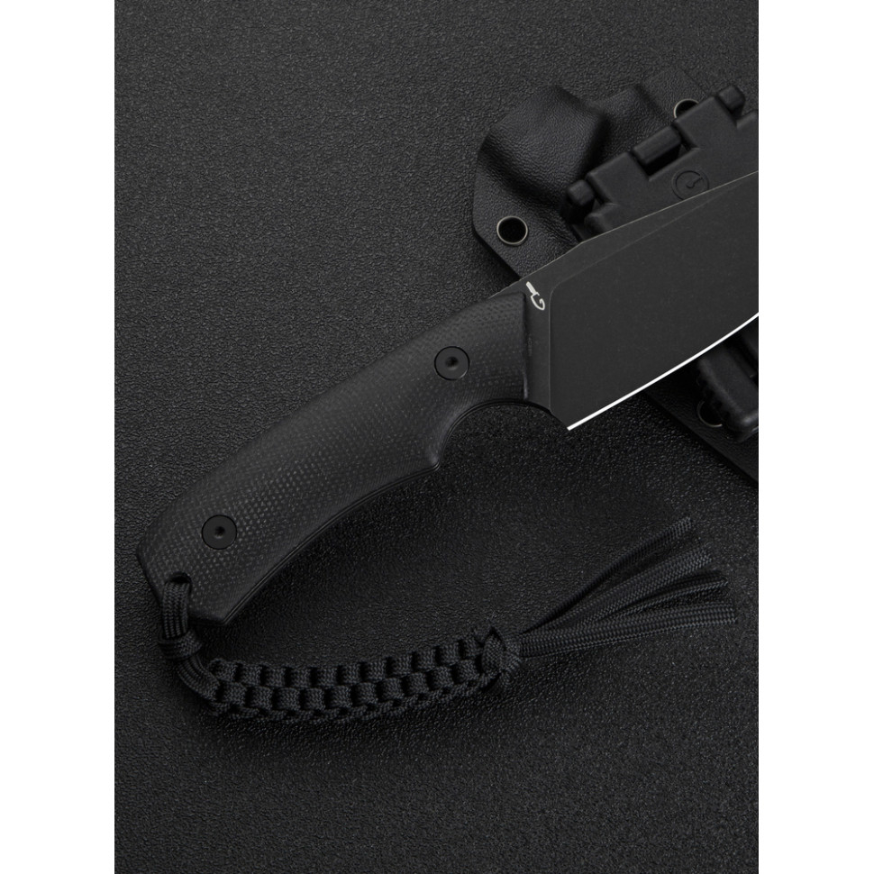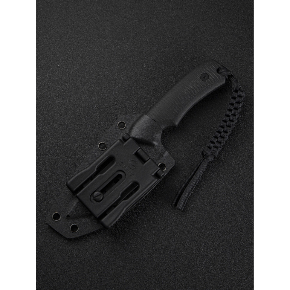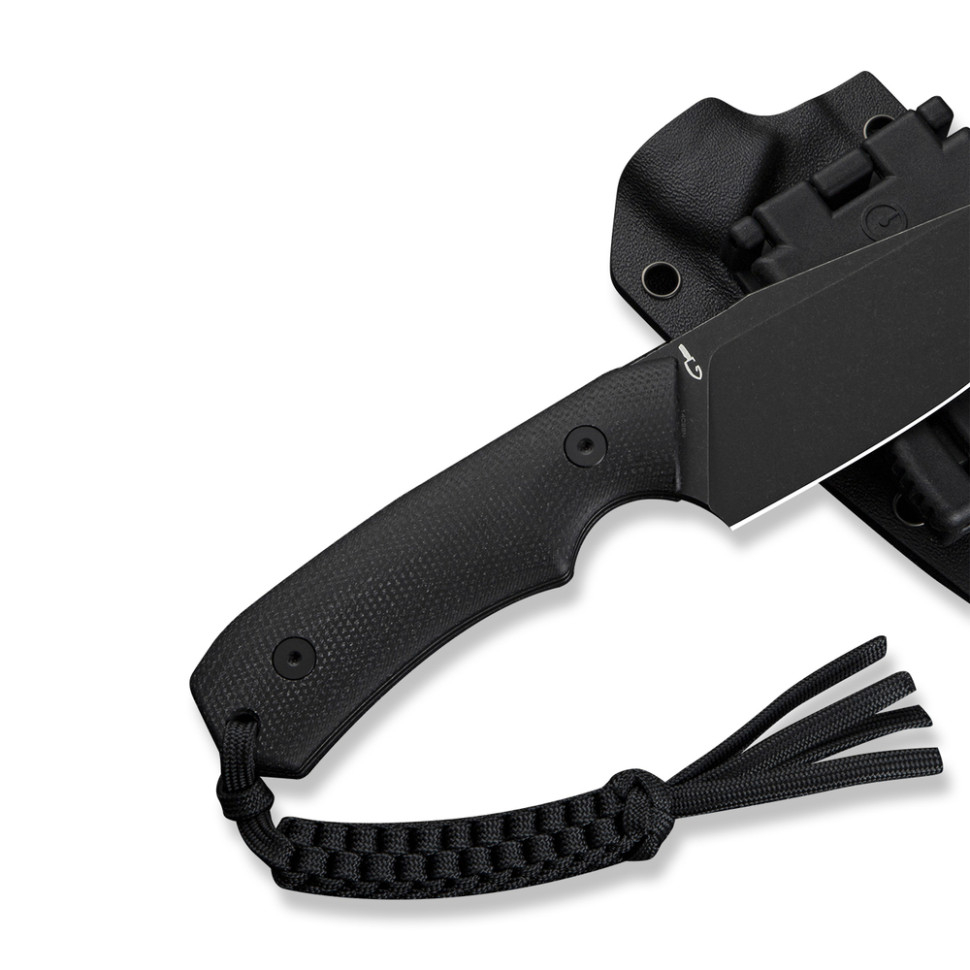Клинок з нержавіючої сталі Sandvik 14C28N. Це високоякісна шведська марка з високою корозійною стійкістю та твердістю 58–60 HRC. Метал легкий в обслуговуванні, а обробка методом галтування з чорним покриттям приховує відбитки пальців.Клинок з нержавіючої сталі Sandvik 14C28N. Руківʼя з мікарти. Багатошаровий композит стійкий до вологи, перепадів температури та механічних навантажень. Шорстка поверхня покращує зчеплення та надає ножу індивідуального характеру.Руківʼя з мікарти.Глибока підпальцева виїмка на руківʼї з чітким упором під вказівний палець запобігає зіслизанню долоні на лезо. Заокруглені краї руківʼя виключають точки тиску, дозволяючи працювати впродовж тривалого часу без наминання руки. У хвості руківʼя закріплено темляк з паракорду.темляк з паракордуУ комплекті є кайдексний чохол з T-подібним кріпленням на пояс. Чохол розроблений легендарним ножовим майстром Бобом Терзуолою та жорстко фіксує ніж без ризику його випадання.кайдексний чохолХарактеристики:Характеристики: