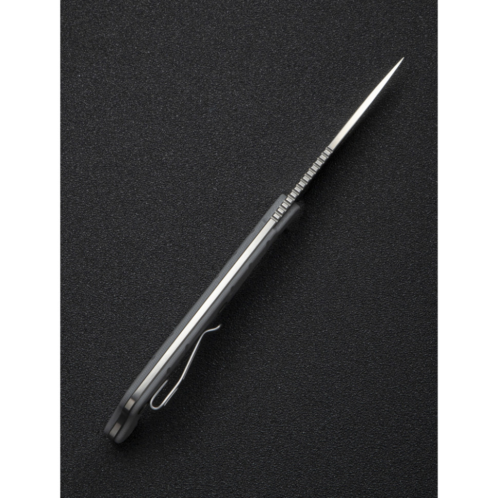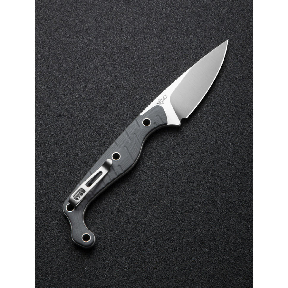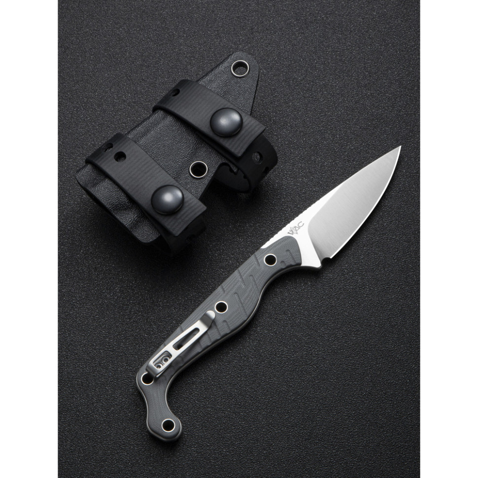 Сталь Nitro-V у клинку. Преміальний сплав містить ±13% хрому та 0.7% вуглецю, що робить метал несприйнятливим до корозії та навантажень під час удару. Твердість знаходиться в межах 59–61 HRC, тому кромка довго зберігає гостроту, залишаючись податливою в обробці. Stonewashed-фініш (галтування) робить поверхню матовою, приховує подряпини та зменшує відблиски.Сталь Nitro-V у клинку.Накладки G10 по обидва боки руківʼя. Багатошаровий композит стійкий до вологи та зношування, не вбирає воду та зберігає цілісність під час механічних впливів. Скошення по краях забезпечують комфортний хват без тиску на долоню. Наскрізні отвори роблять ніж легшим і дозволяють кріпити його на спорядженні в різних положеннях.Накладки G10 по обидва боки руківʼя.У хвості руківʼя закріплено кліпсу з нержавіючої сталі, орієнтовану на Tip-Down носіння. Затискач забезпечує міцну фіксацію інструмента в кишені або на спорядженні, не виступаючи за межі габаритів. Положення кліпси можна міняти під зручну руку — встановлювати з правого або лівого боку конструкції.кліпсу з нержавіючої сталіУ комплекті також є чохол з кайдекса з двома ремінцями для кріплення на поясі, лямці рюкзака або системі MOLLE.чохол з кайдексаХарактеристики:Характеристики: