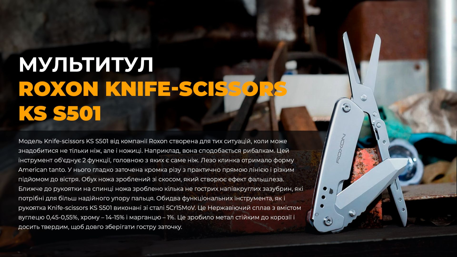 Мультитул KS S501U — оновлена версія моделі Roxon KS S501, яка стала ще практичнішою та універсальнішою у використанні завдяки декільком змінам у конструкції. Модель складається з 2 інструментів, здатних покрити базові потреби під час активного відпочинку, риболовлі, полювання, де необхідні гострі леза для приготування страв на свіжому повітрі, налаштування та ремонту спорядження, надання екстреної допомоги в умовах виживання.