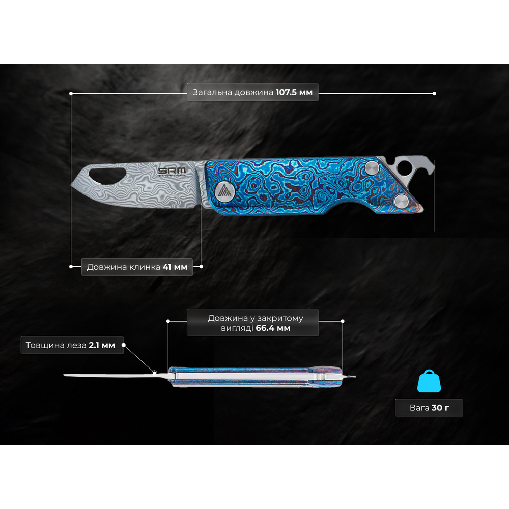 Клинок із дамаської сталі. Багатошарова структура має твердість 58–60 HRC, завдяки чому лезо тримає гостроту навіть після тривалої роботи з абразивним картоном, папером чи пластиком. Кожен ніж має свій неповторний малюнок шарів сталі, що виникає в процесі виробництва.Клинок із дамаської сталі.Руків’я з титану. Вибір титанового сплаву забезпечив мінімальну вагу інструмента (30 г) при збереженні жорсткості конструкції. Метал не іржавіє і зберігає властивості під дією вологи чи хімічних середовищ. Блакитне анодування та візерунок на поверхні стійкі до зношування та повторюють графіку дамаського леза.Руків’я з титану.Блакитне анодуванняНіж відкривається двома руками за допомогою нігтьового зачепа. Механізм Slip Joint утримує клинок у відкритому стані за допомогою тиску пружини, що виключає випадкове складання під час роботи, але дозволяє швидко закрити ніж після використання.