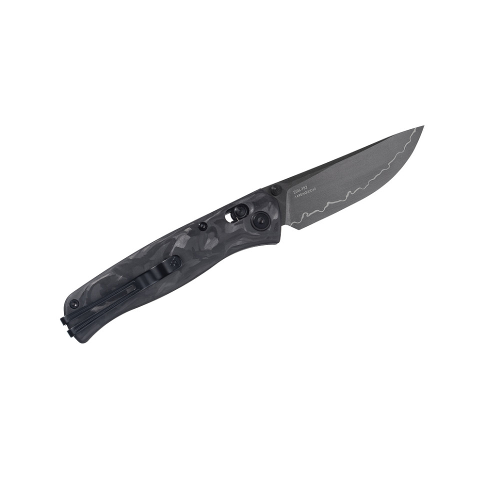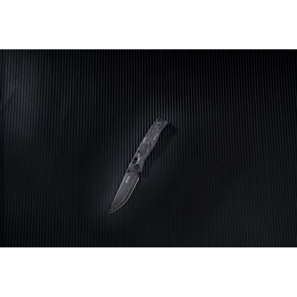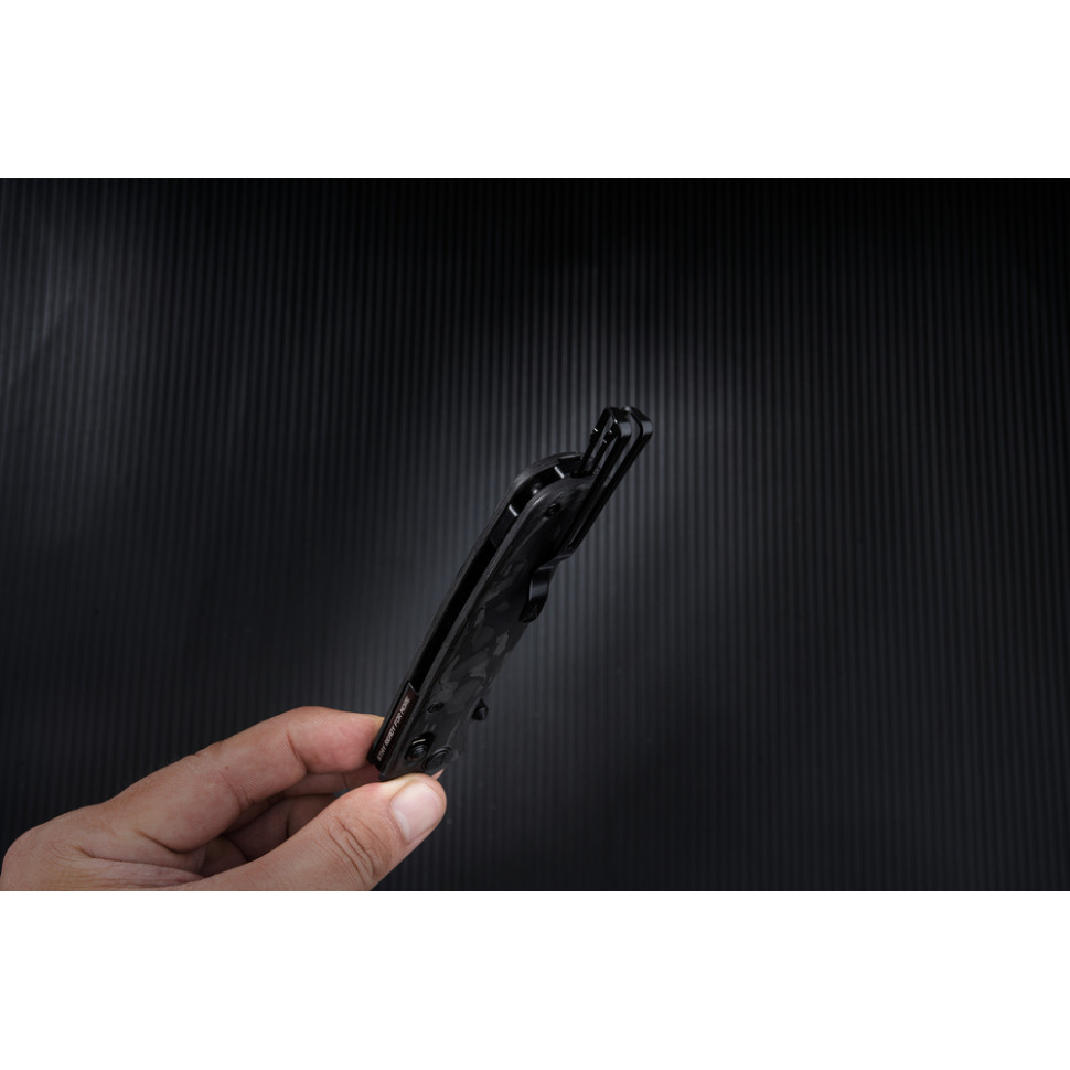 Клинок з ламінованої нержавіючої сталі 140Cr (140Cr14MoV3Nb). У багатошаровій сталі поєднуються твердий сердечник та в'язкі зовнішні шари для стійкості до сколів. Твердість на рівні 60–62 HRC гарантує тривале утримання гостроти з можливістю швидкого виправлення без зайвих зусиль. За сукупністю властивостей марку 140Cr можна порівняти зі сталлю S35VN, що робить її оптимальним вибором без переплати за преміальність.Клинок з ламінованої нержавіючої сталі 140Cr (140Cr14MoV3Nb).Руківʼя з вуглецевого волокна (карбон). Накладки з вуглеволокна відрізняються легкою вагою, стійкістю до ударів, температурних перепадів та контакту з вологою. Шорстка фактура надає надійний хват, зокрема якщо ви носите щільні рукавички.Руківʼя з вуглецевого волокна (карбон). Для відкриття ножа достатньо натиснути одним пальцем на двосторонній шпеник, який однаково зручний для взаємодії правою та лівою рукою. Керамічні підшипники роблять рух леза плавним та передбачуваним.Керамічні підшипникиЗа фіксацію клинка відповідає фірмова система Ambi Lock (Crossbar Lock) у поєднанні з Mono-Chassis Liner. Поперечний штифт замикає лезо з двох боків, забезпечуючи стійкість до поздовжніх та поперечних навантажень.У хвості закріплено сталеву кліпсу, яка дозволяє повністю сховати ніж у кишені для непомітного носіння.сталеву кліпсуХарактеристики:Характеристики: