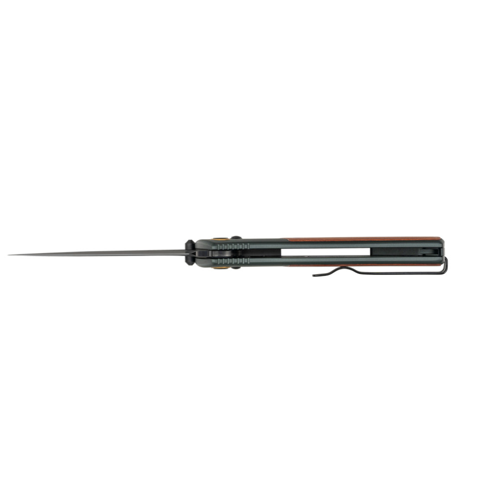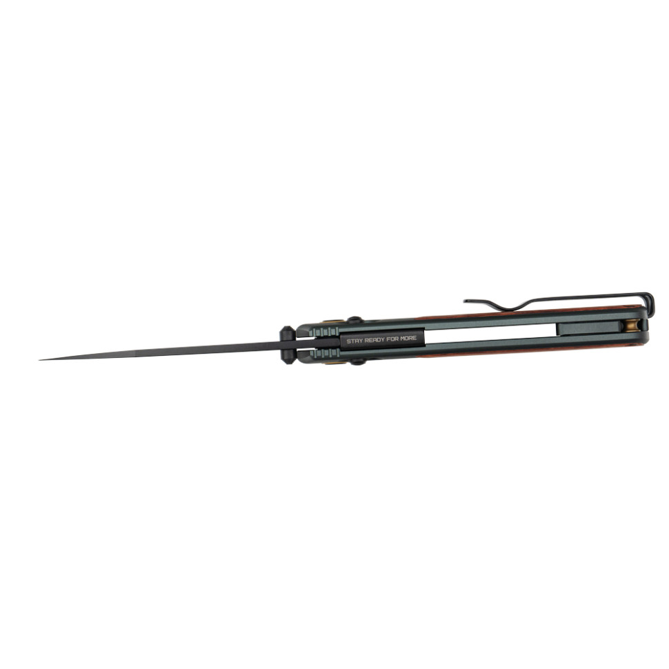 колір – коричневий;профіль клинка – зворотний танто;матеріал клинка – шведська нержавіюча сталь Sandvik 14C28N;твердість клинка – 57-59 HRC;тип заточування – прямий;спосіб відкриття – двосторонній шпеник;керамічні підшипники в осьовому вузлі;тип запірного механізму – замок Ambi Lock (Crossbar Lock);матеріал руківʼя – анодований алюміній 6063 + рожеве дерево;є сталева кліпса Ambi Clip;повна довжина – 193 мм;довжина клинка – 81 мм;товщина в обуху – 2.6 мм;вага – 75 г.