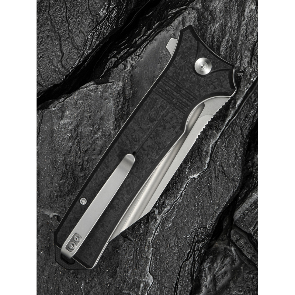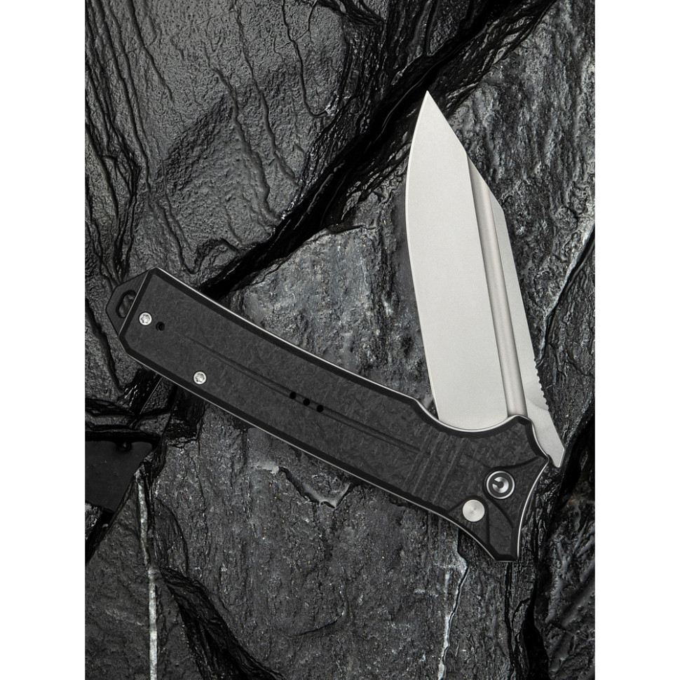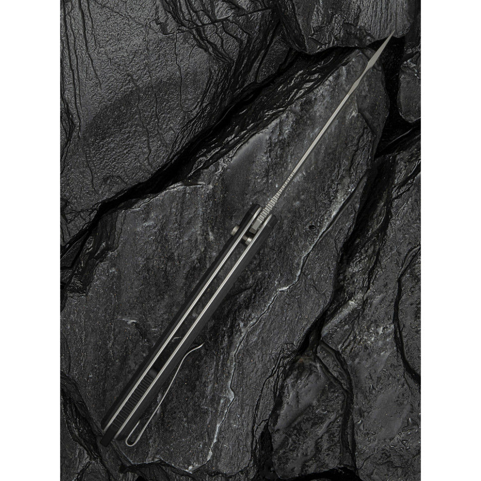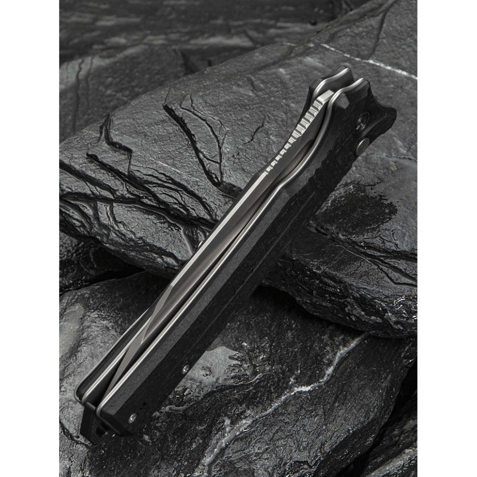 складаний ніж-фліпер для повсякденного носіння (EDC);матеріал клинка – преміальна сталь Nitro-V з антикорозійними властивостями;метод обробки клинка – галтування;твердість сталі – 59-61 HRC;форма клинка – Clip Point;тип заточування – прямий;є упор для великого пальця;тип запірного механізму – замок Button Lock;осьовий вузол з керамічними підшипниками;матеріал накладок на руківʼї – G10;двопозиційна кліпса виготовлена з нержавіючої сталі;довжина у відкритому положенні – 224,9 м;довжина клинка – 94,9 мм;товщина обуха – 3 мм;довжина закритого ножа – 130 мм;товщина руківʼя – 13 мм;вага – 122,5 г.