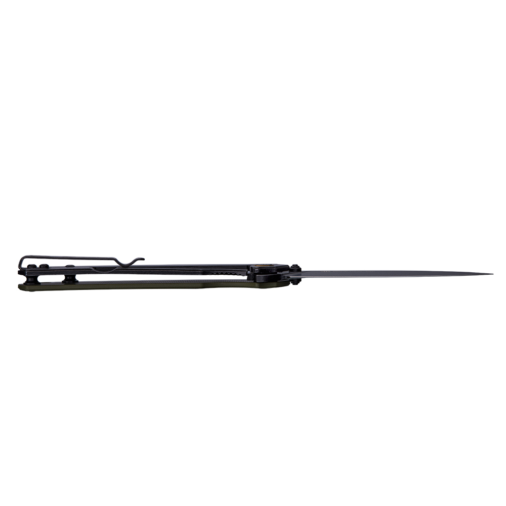складаний EDC ніж, оновлена версія бестселера Ruike P801-SF;клинок зі сталі Sandvik 14C28N з чорним покриттям;твердість клинка – 57-59 HRC;форма клинка – Drop Point;кріогенна обробка клинка + галтування (stonewash);тип заточування – прямий;запірний механізм frame lock;декілька варіантів відкривання інструмента;матеріал руківʼя – нержавіюча сталь + склопластик G10 зеленого кольору;є однопозиційна кліпса та отвір для темляка;повна довжина – 200 мм;довжина клинка – 86 мм;товщина клинка в обуху – 3.1 мм;довжина руківʼя – 114 мм;вага – 86 г;гарантія – 5 років.