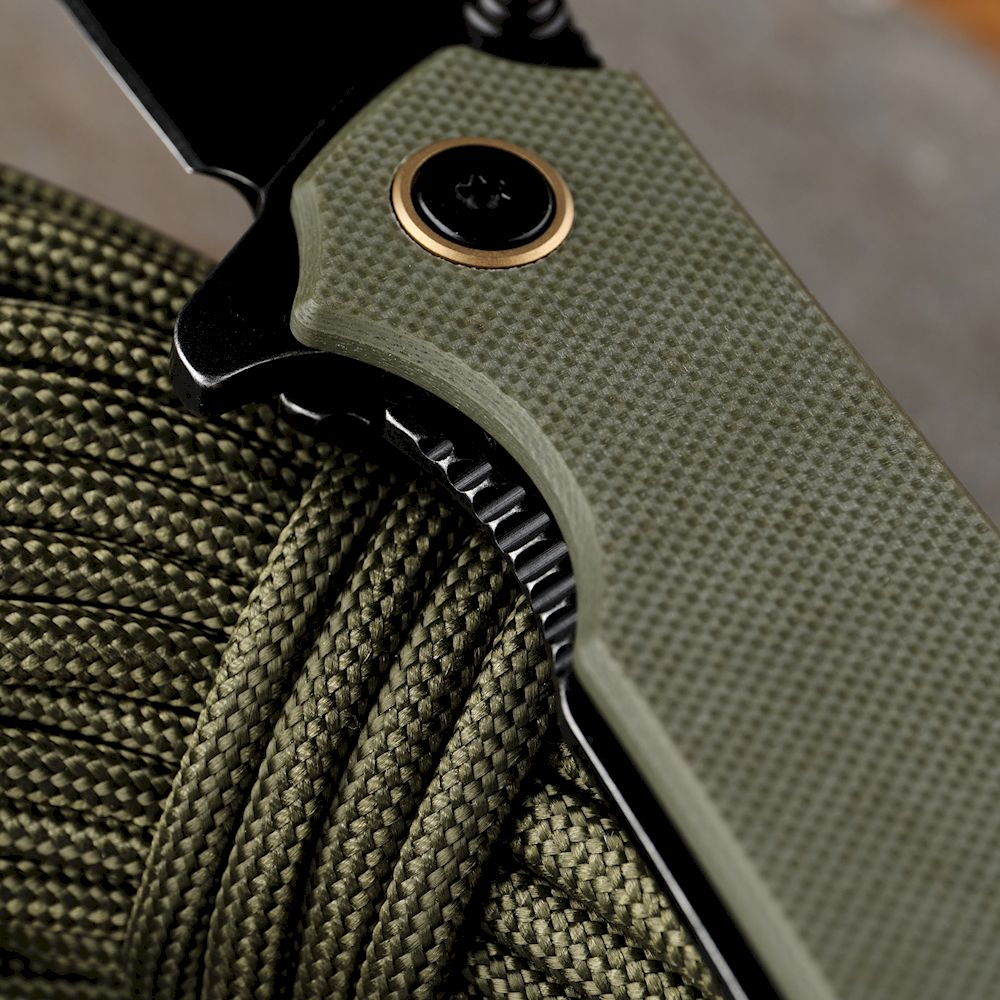 У руківʼї використано два матеріали: з одного боку це нержавіюча сталь, з іншого — ударостійкий склопластик G10. Ця комбінація підвищує зручність утримання конструкції в руці завдяки шорсткій поверхні композитної плашки та зберігає одну з основних переваг ножа — його стильний зовнішній вигляд.