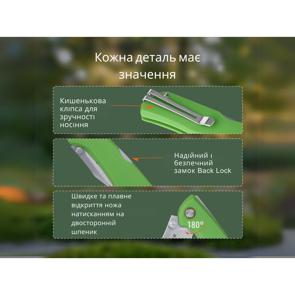 кишеньковий ніж для повсякденного носіння;колір – зелений;матеріал клинка – нержавіюча сталь Sandvik 12С27;твердість клинка – 57-59 HRC;тип заточування – прямий;відкриття ножа натисканням на двосторонній шпеник;тип блокувального механізму – замок Back lock;матеріал руківʼя – склопластик G10;повна довжина ножа – 193 мм;довжина клинка – 85 мм;товщина в обуху – 2,5 мм;вага – 71,8 г;є сталева кліпса для прихованого носіннягарантія - 5 років.
