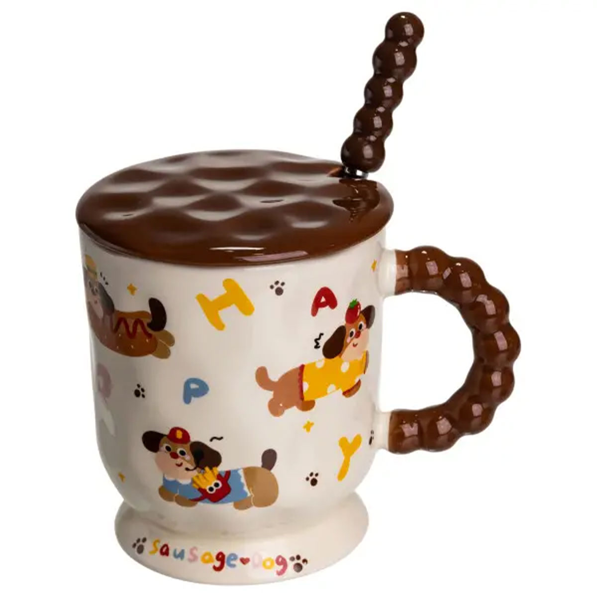 Новорічна порцелянова чашка "Весела Такса" з кришкою та ложкою 400 мл, Святкова кружка чашка для дітей на подарунок FM-17B
