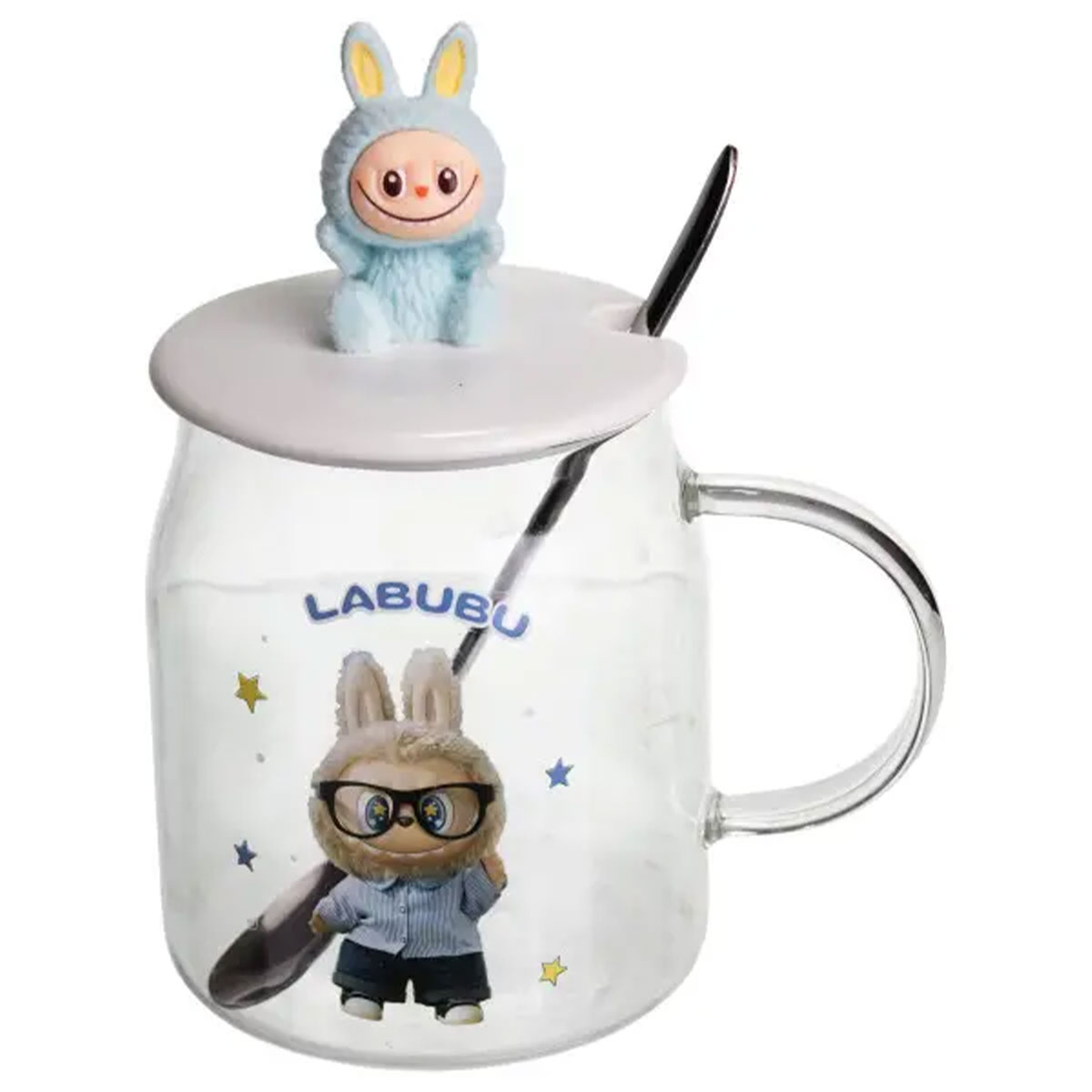 Новорічна велика скляна чашка "Лабубу" з кришкою та ложкою 600 мл, Святкова кружка чашка для дітей на подарунок Блакитний FM-56D