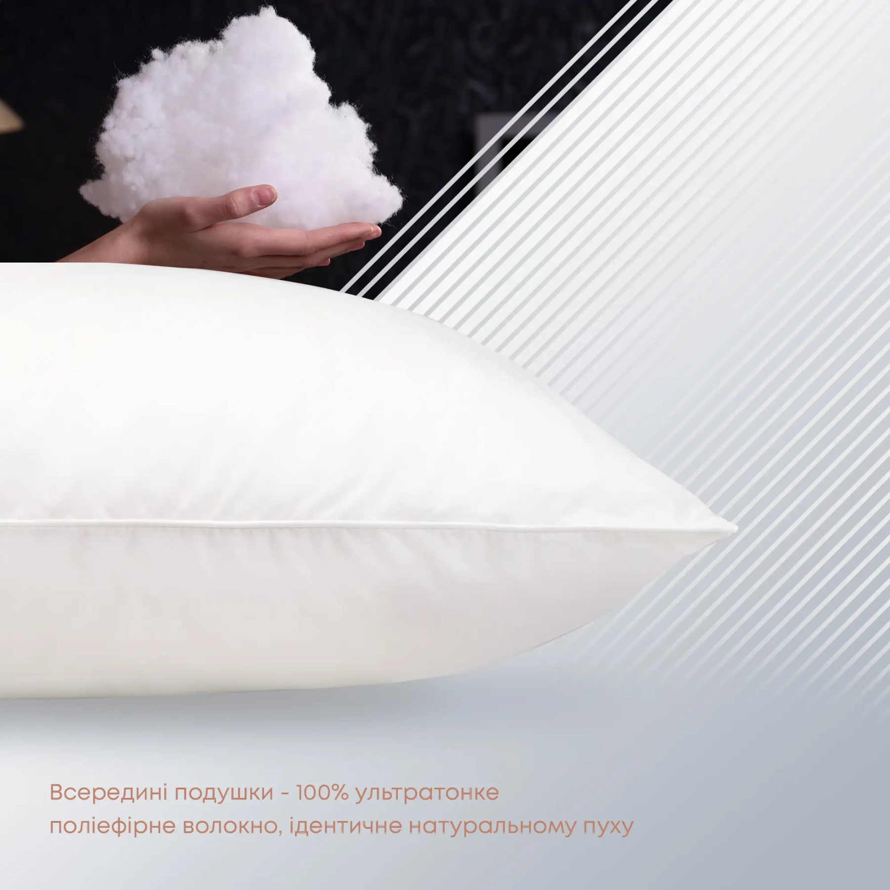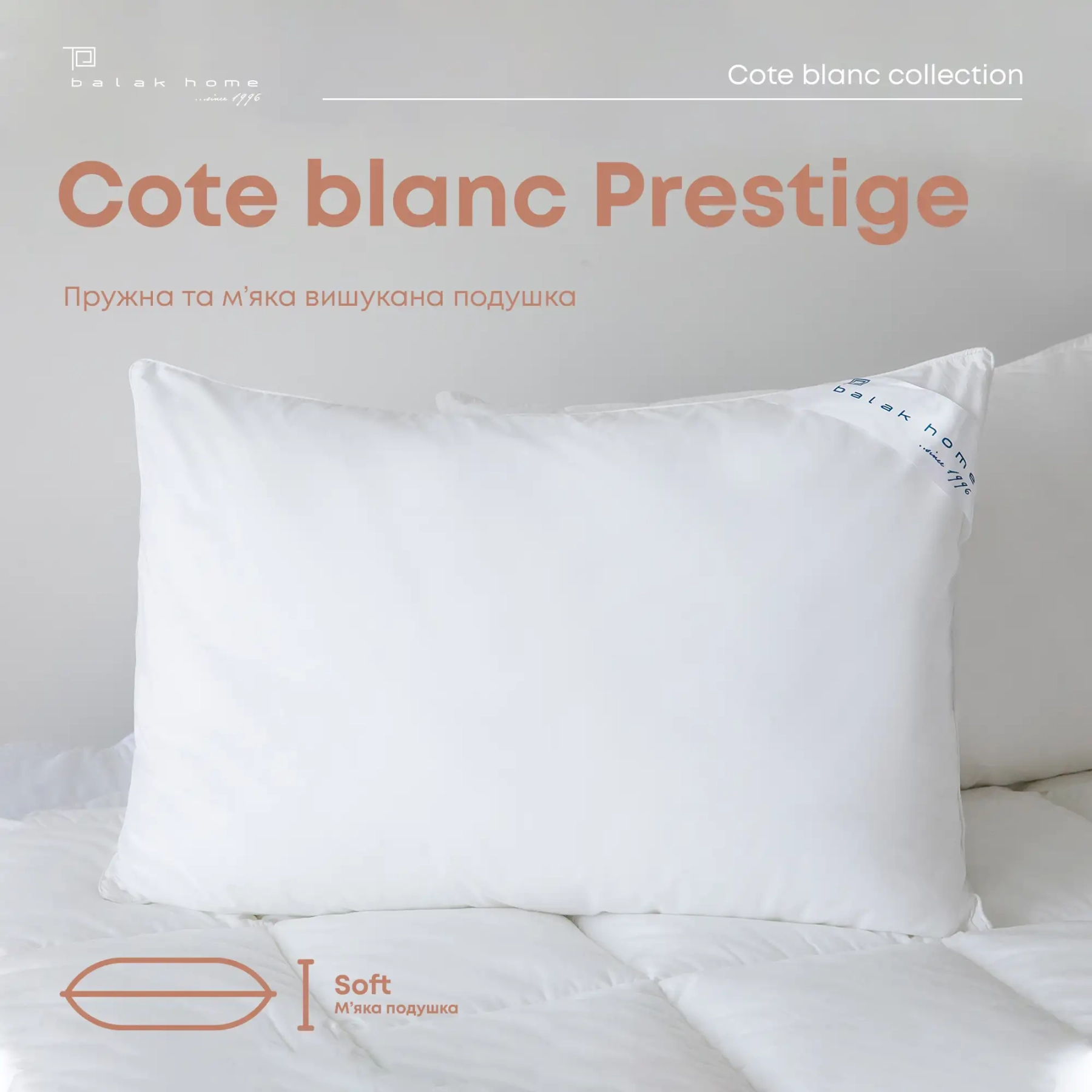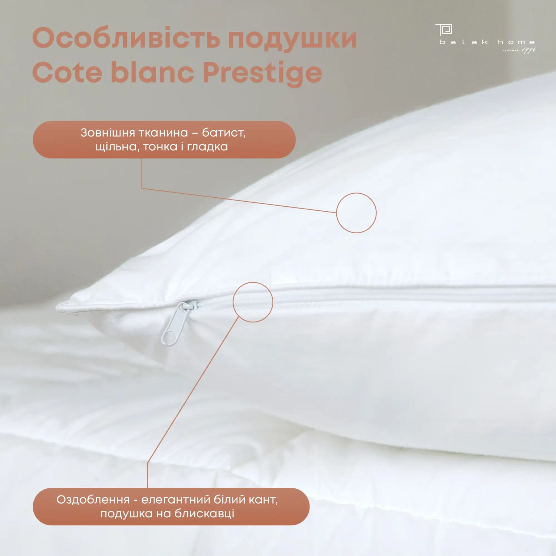 Подушка COTE BLANC PRESTIGE - це натуральна пружна, пишна і м'яка подушка, яка поєднує в собі тонкість і гладкість шовку, ніжність і комфорт бавовни. Наповнювач подушки - ультратонке поліефірне волокно, яке поєднує в собі теплозахисні та вентиляційні властивості, що не абсорбує сторонні запахи, перешкоджає розвитку пилового кліща, молі і цвілі, які викликають алергію, посилюють астму. Забезпечує вільну циркуляцію повітря. Підходить для людей з чутливою шкірою. Також подушка проста у використанні, витримує велику кількість прань і швидко сохне.
