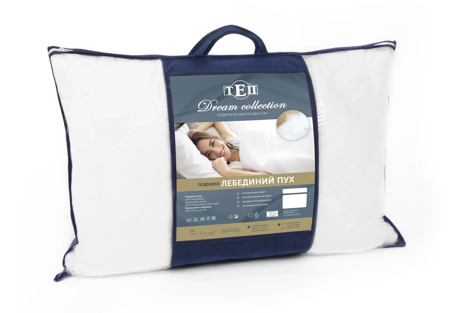 Зручна м'яка подушка на основі ніжного ультратонкого полієфірного волокна, штучного лебединого пуху, який не відрізняється від справжнього.