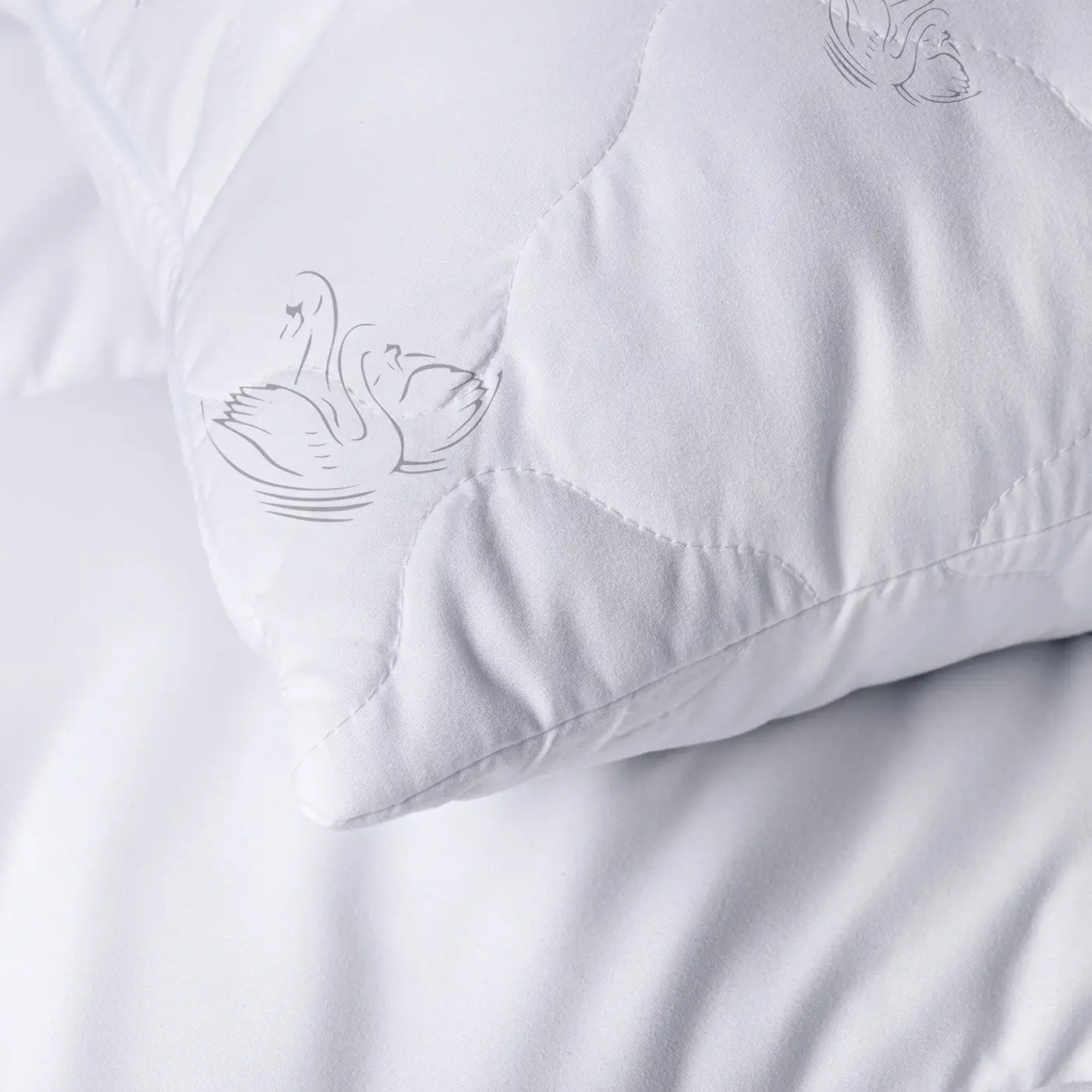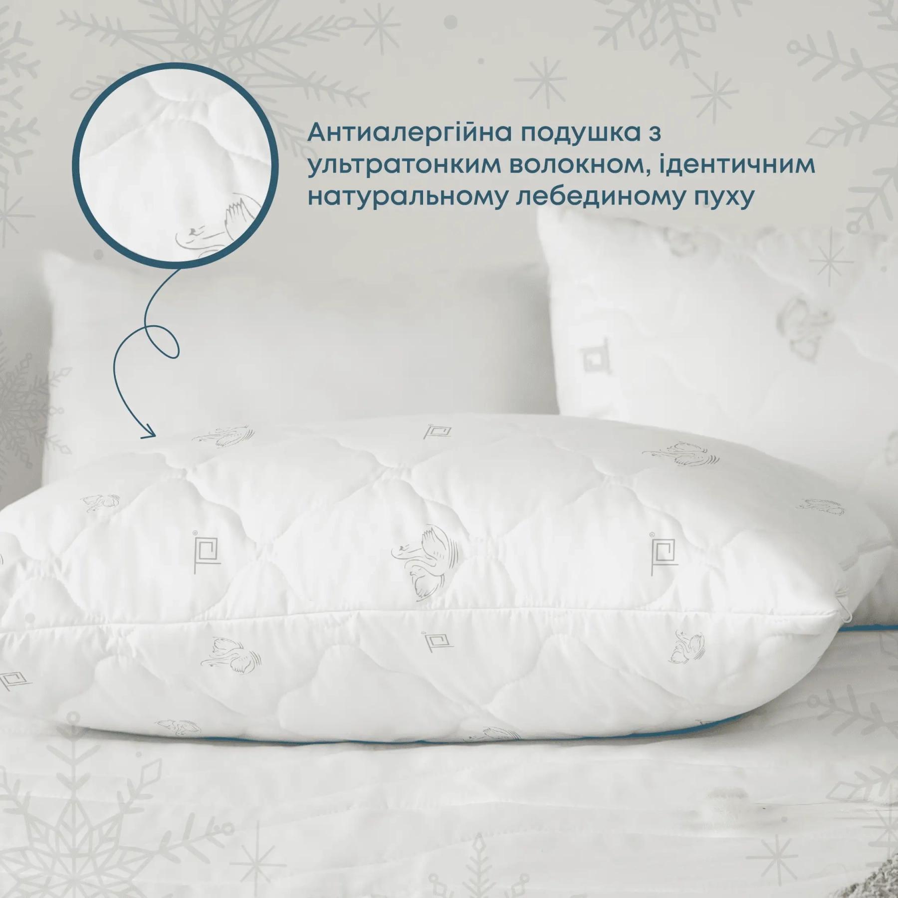 Вишукана антиалергенна стебнована подушка з волокном, ідентичним натуральному лебединому пуху у лімітованому атмосферному святковому упакуванні. Ідеально для подарунку собі чи близьким.