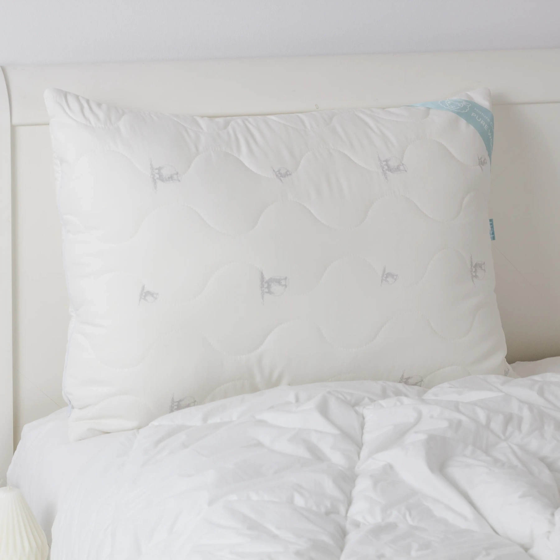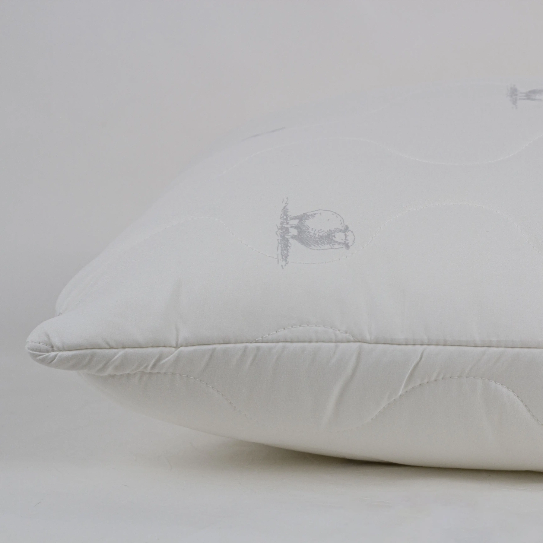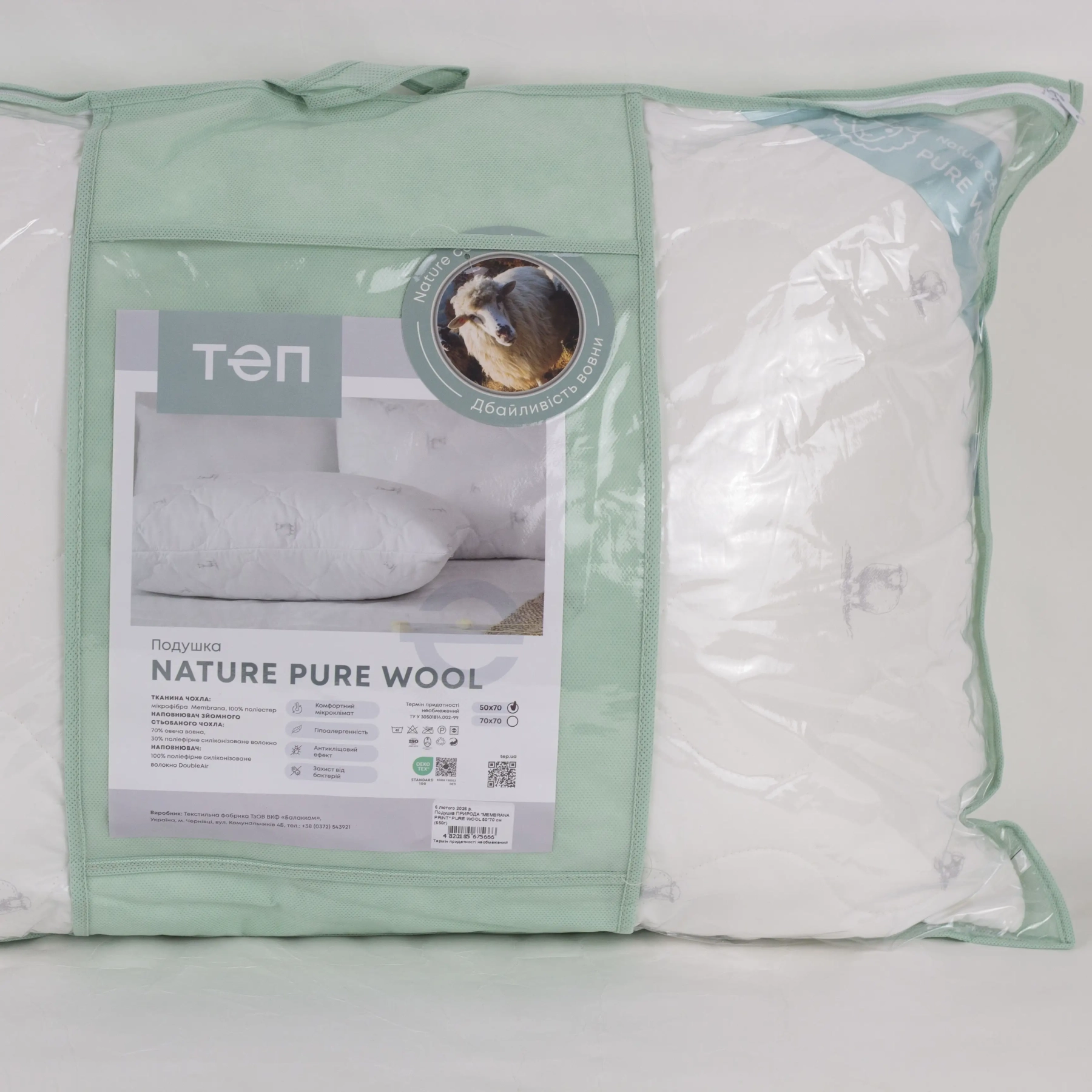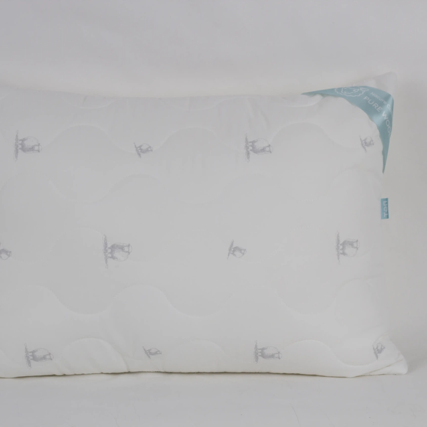 Натуральна овеча вовна пристебана до зйомного чохла, а всередині подушки – поліефірне силіконізоване волокно Double Air, антиалергійне, пружне, відмінно відновлює форму.