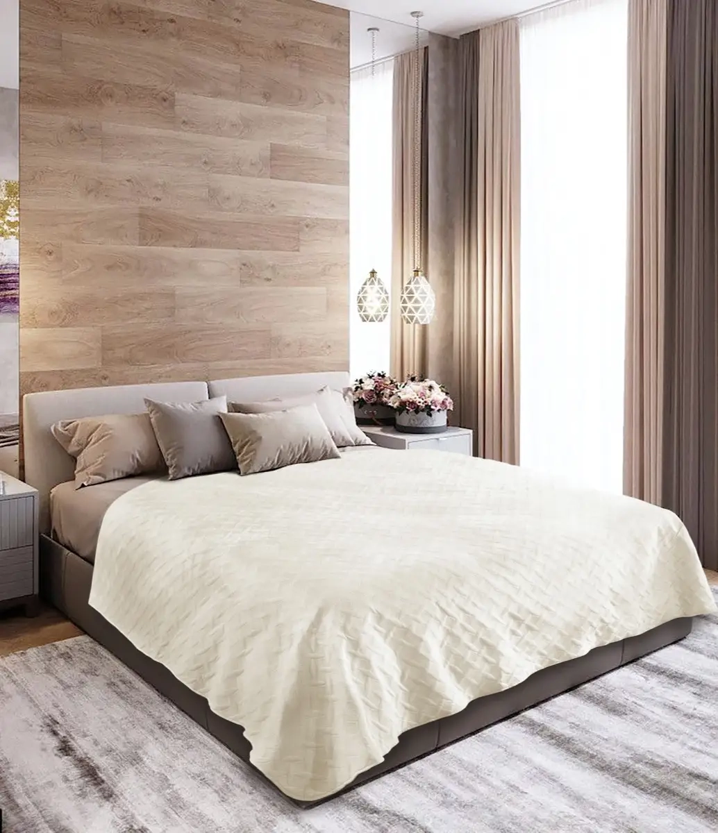 Наповнювач в покривалах VELURE – силіконізоване поліефірне полотно. Воно не вбирає пил і бруд, не викликає алергічних реакцій, швидко сохне після прання. Тонкий шар наповнювача всередині покривала дає можливість використовувати його влітку як тонку ковдру. Покривало VELURE - дбайливо розроблений дизайн, який доповнить затишну атмосферу спальні.