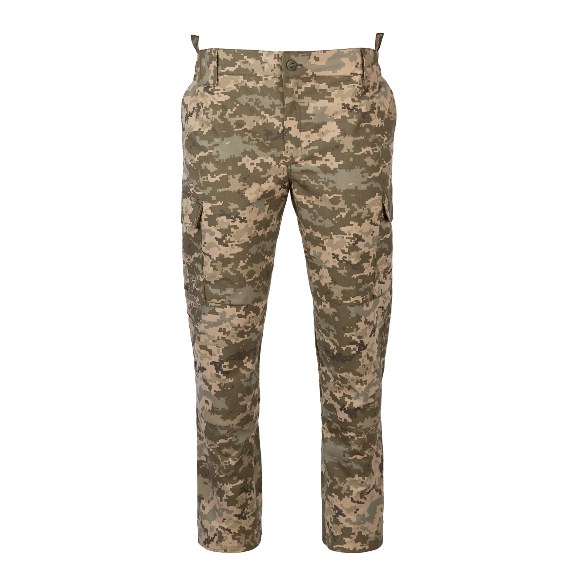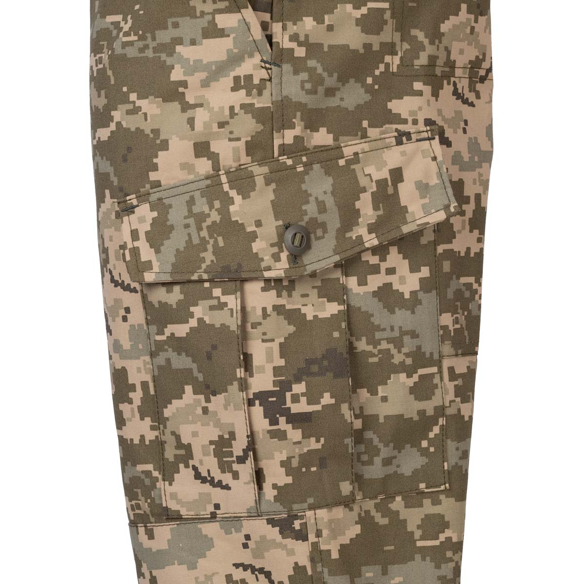 - Штани: Пояс із петлями для ременя (до 5 см), блискавка та ґудзик, регульовані гумки, низ на липучках, 6 кишень (поясні, карго, задні з клапанами).
