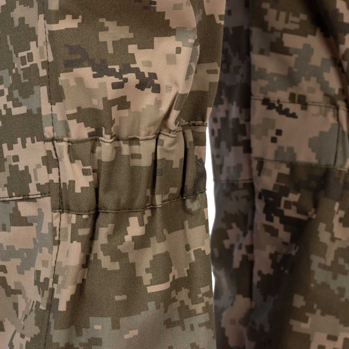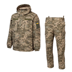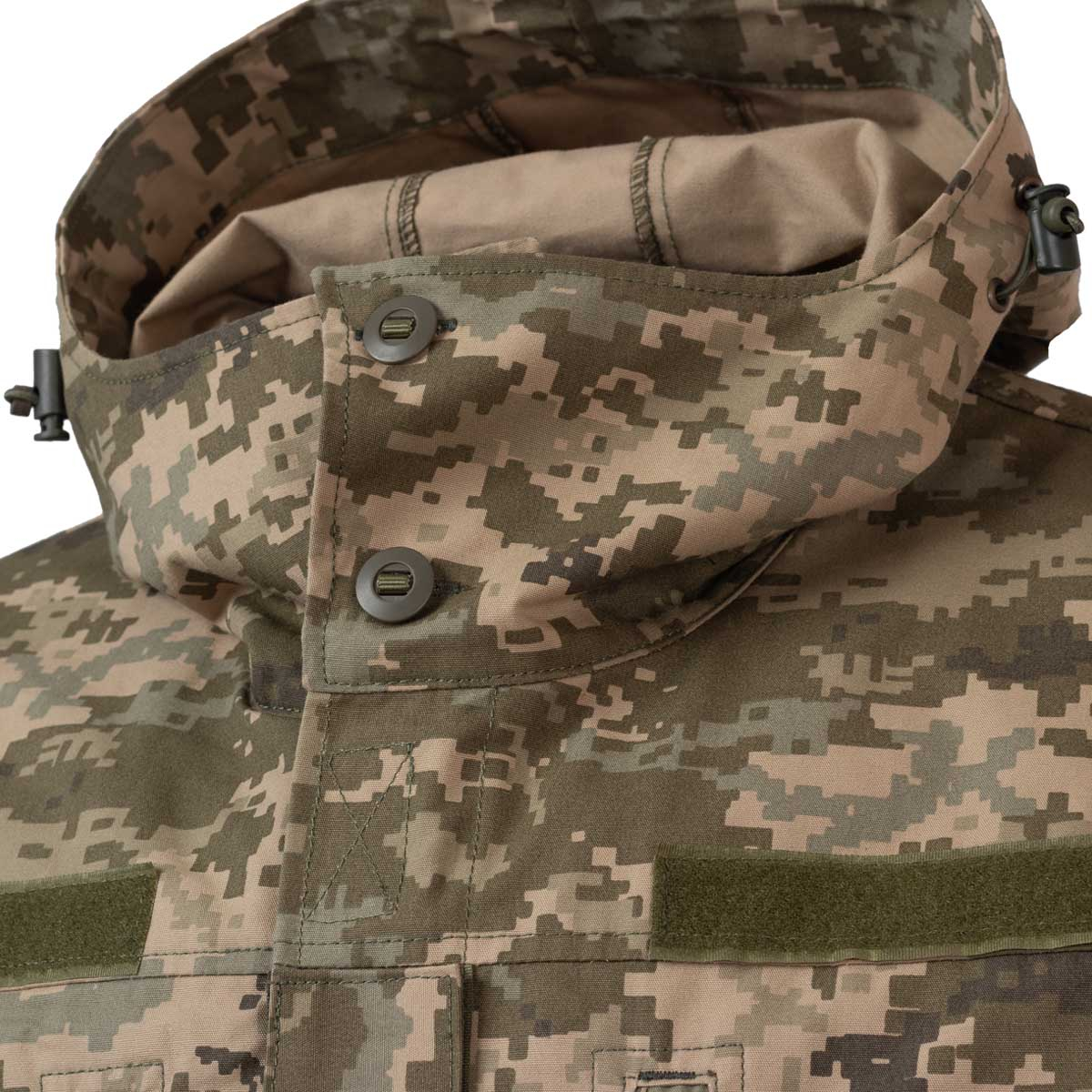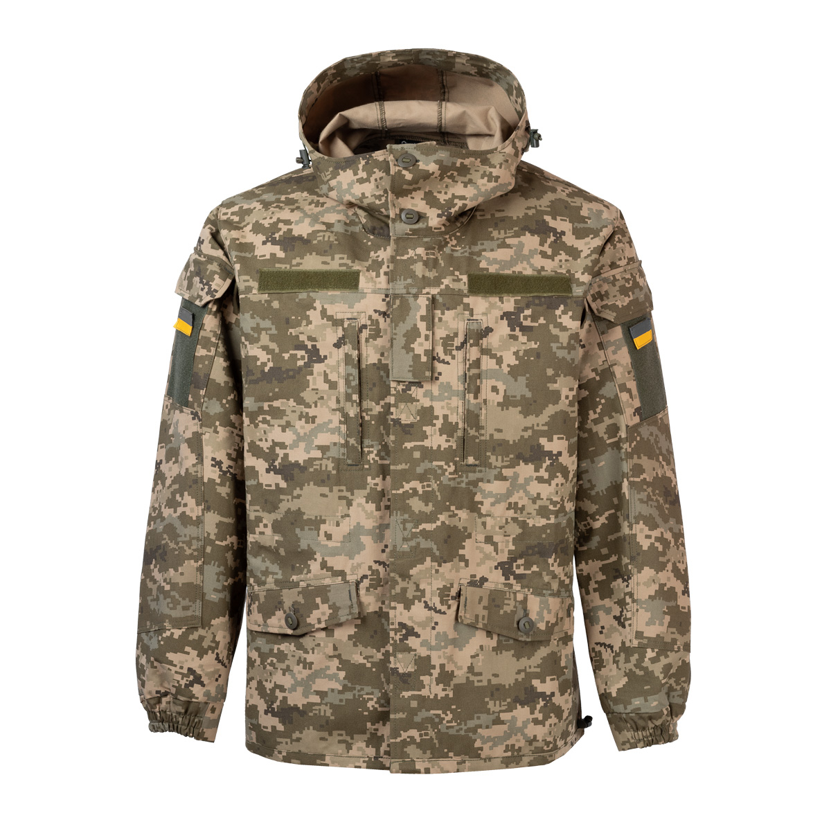Комплект включає куртку та штани:- Куртка: Подвійна блискавка, планка на ґудзиках, велкро-панелі для шевронів, регульований капюшон і талія, 6 кишень (нагрудні на блискавках, нижні з клапанами).
