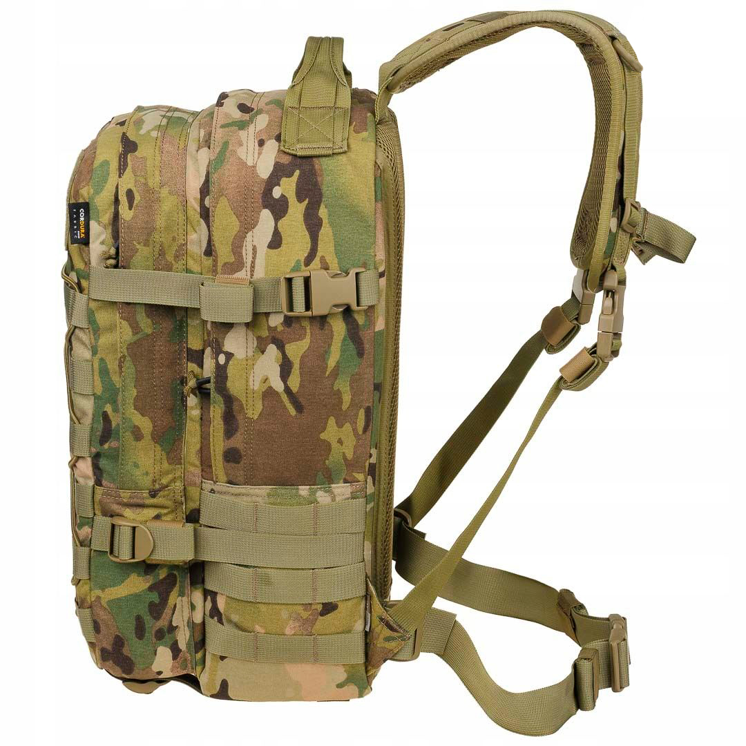Рюкзак Helikon Raccoon Mk2 об’ємом 24 літри – це вдосконалена модель від польського бренду Helikon-Tex, призначена для повсякденного використання, коротких походів або тактичних завдань. Виготовлений із міцного нейлону Cordura® 500D, він забезпечує стійкість до розривів і зносу. Основне відділення закривається двосторонньою блискавкою YKK® і оснащене кишенею для гідратаційної системи з кількома виходами для мундштука, а також сітчастим карманом на блискавці для дрібних речей. Додатково є велика передня кишеня, аналогічна за розміром основному відсіку, із простим органайзером для зручного розміщення аксесуарів. Система перенесення включає регульовані плечові лямки з м’якою оббивкою, нагрудний ремінь і знімний поясний ремінь, що розподіляють вагу для комфорту при тривалому носінні. Зовнішня поверхня оснащена стропами MOLLE/PALS для кріплення додаткового спорядження, а еластичний шнур і компресійні ремені дозволяють фіксувати додаткові предмети, такі як одяг чи килимок. Панель Velcro на передній частині дає змогу прикріпити нашивки чи емблеми.