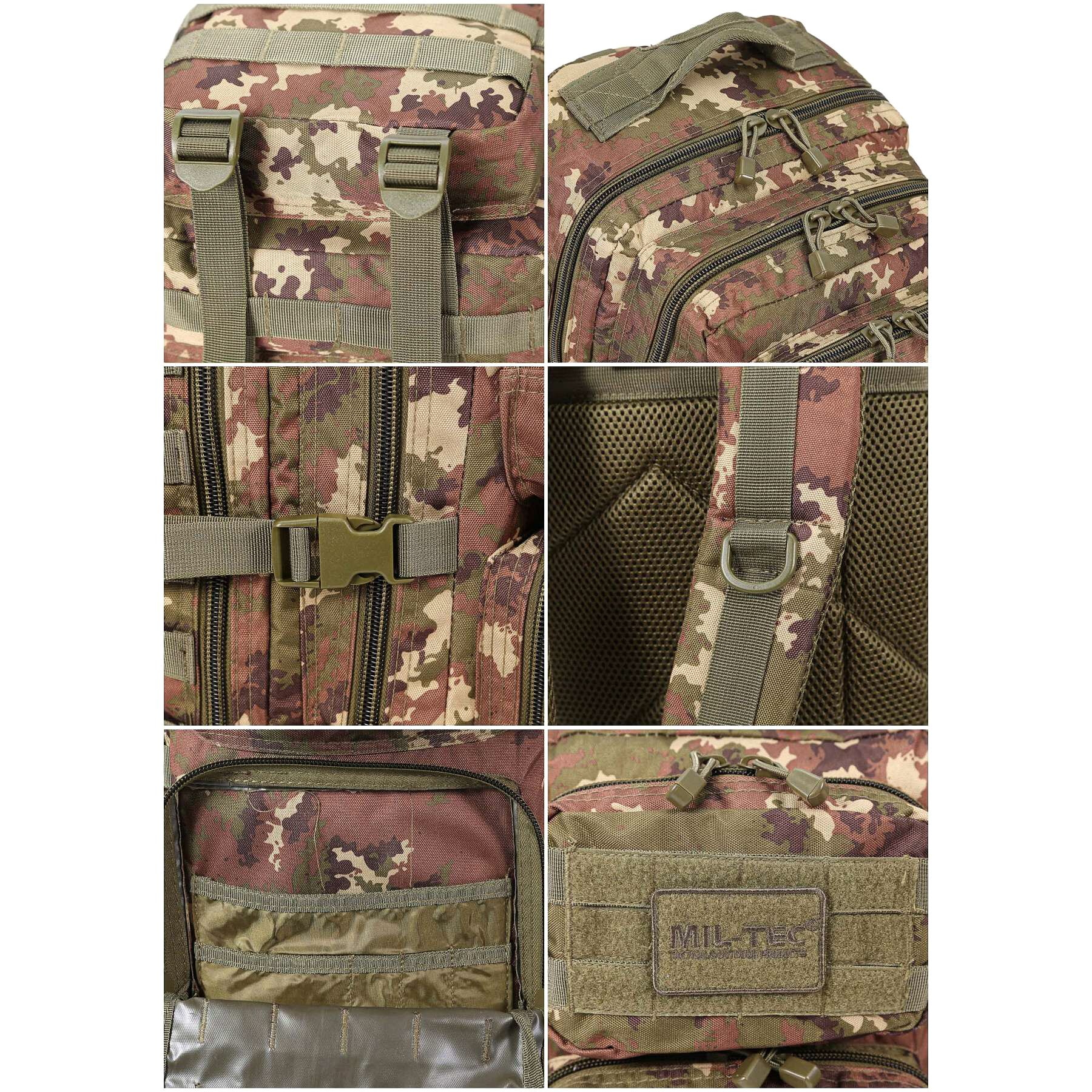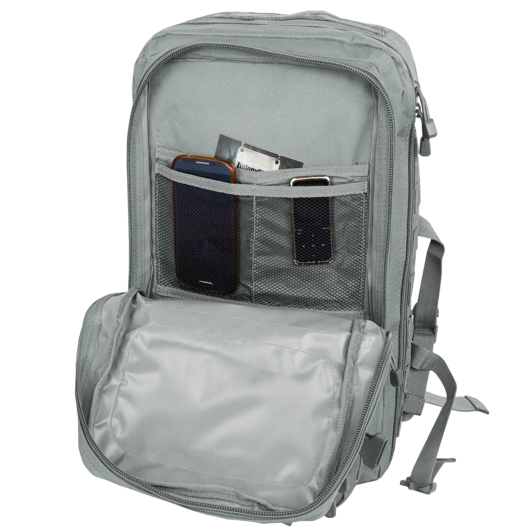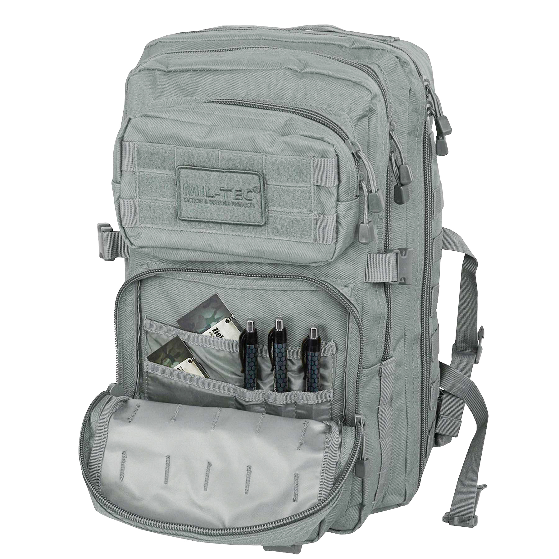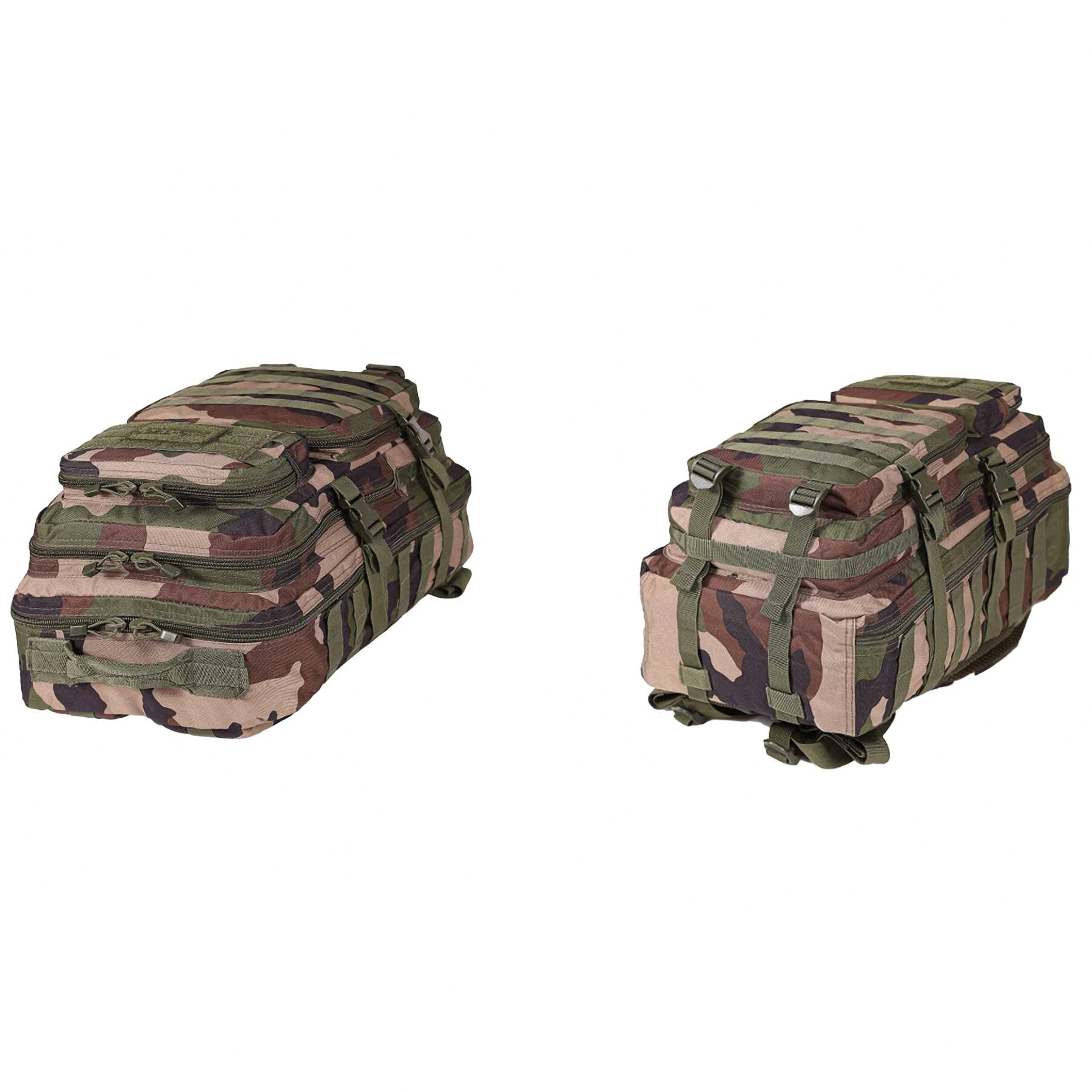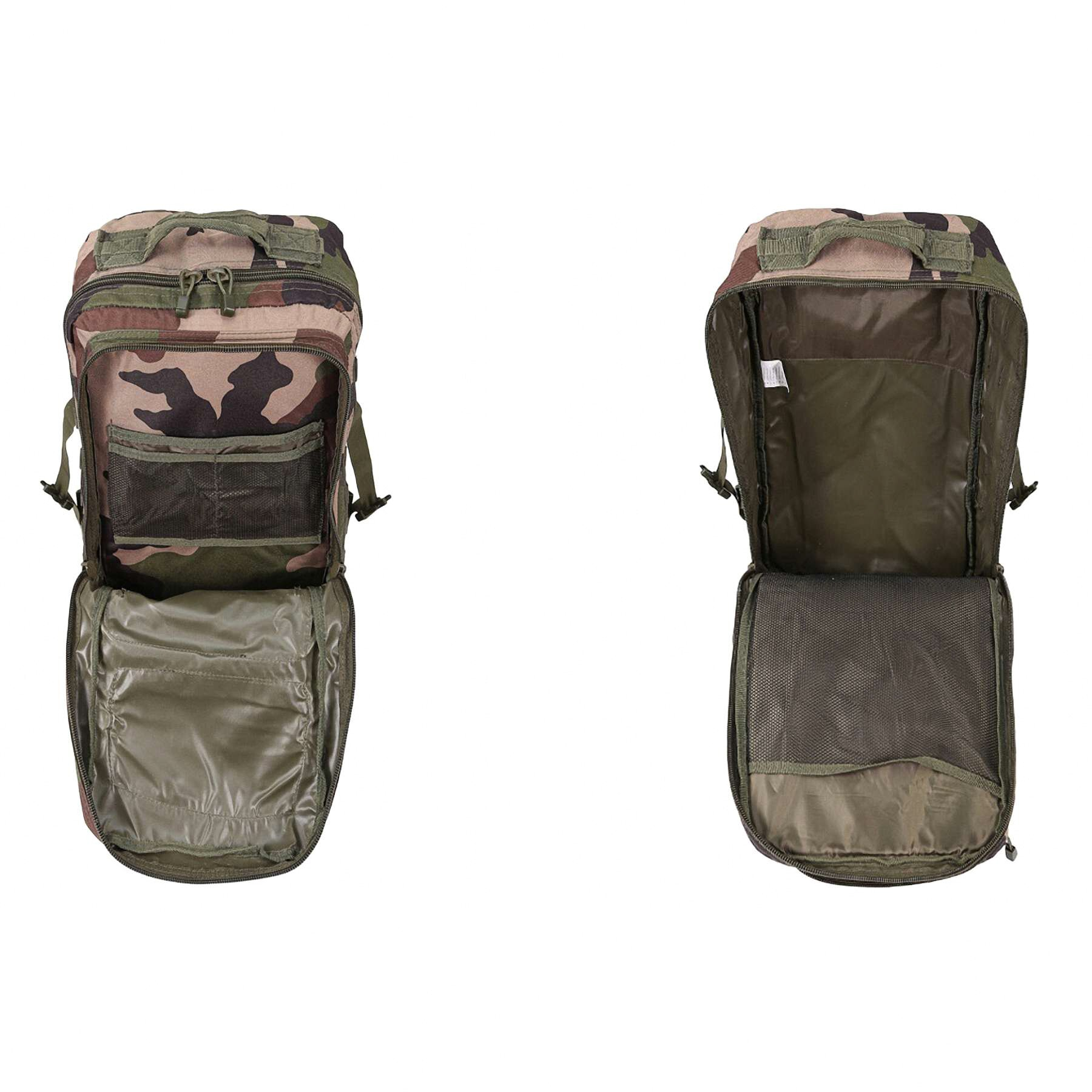 Рюкзак має два основних відділення з двосторонніми блискавками, внутрішні сітчасті кишені та органайзер для зручного розміщення речей. Дві передні кишені забезпечують швидкий доступ до дрібних предметів. Система MOLLE на передній і бічних частинах дозволяє кріпити додаткові підсумки та спорядження. Ергономічна спинка з м’якою підкладкою, регульовані лямки з D-кільцями та знімний поясний ремінь гарантують комфорт під час тривалого носіння. Рюкзак також оснащений бічними компресійними стропами для регулювання об’єму та ручкою для перенесення.