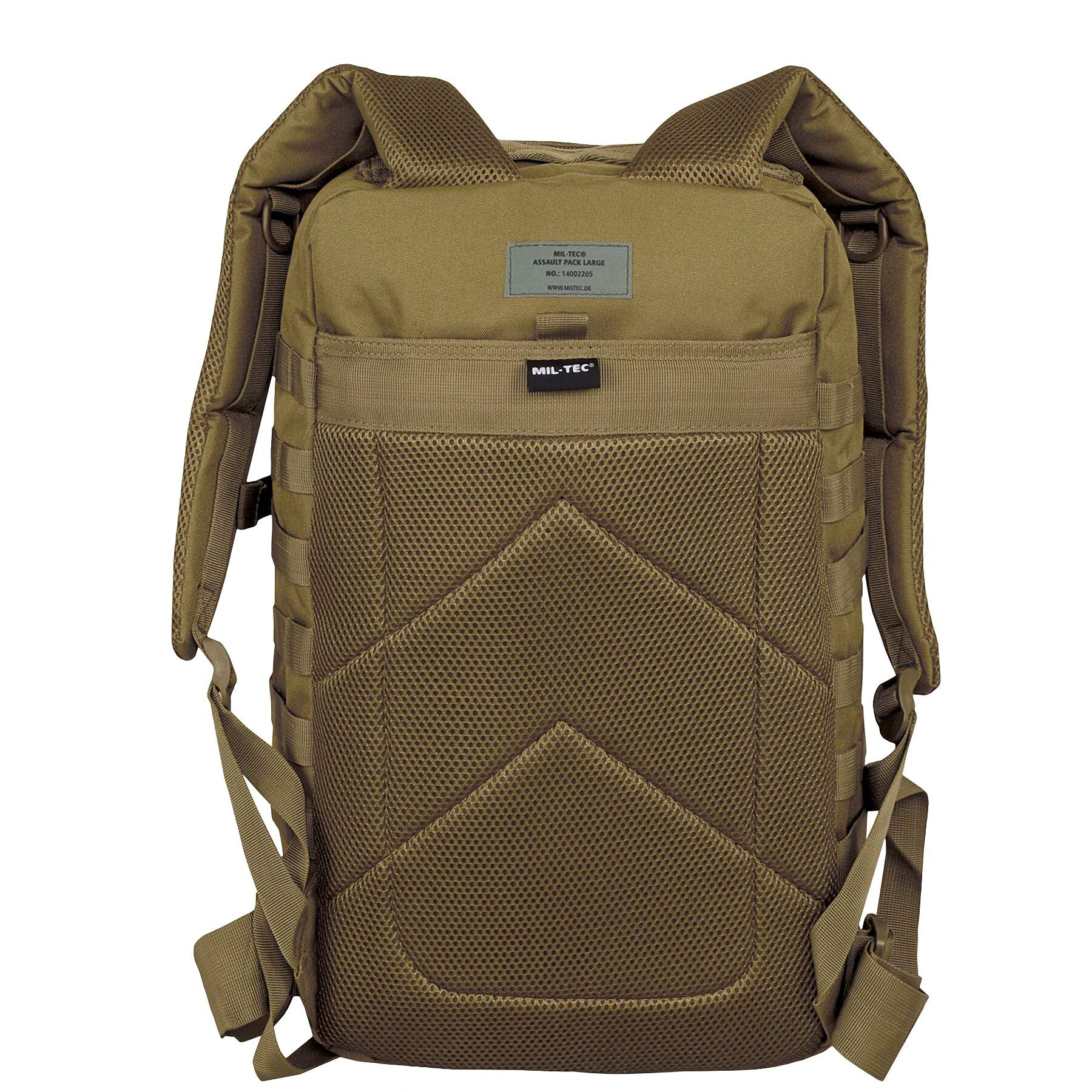 Рюкзак Assault виготовлений німецькою компанією Mil-Tec з дуже міцного матеріалу. Спереду та з боків рюкзак має стропи MOLLE шириною 2,5 см, що дозволяють кріпити підсумки та інше спорядження. Спинка і плечові лямки шириною 5 см підбиті м'яким наповнювачем і забезпечують високий комфорт під час походу. Плечові лямки та поясний ремінь регулюються. Об'єм рюкзака регулюється 4 компресійними ременями з боків.
