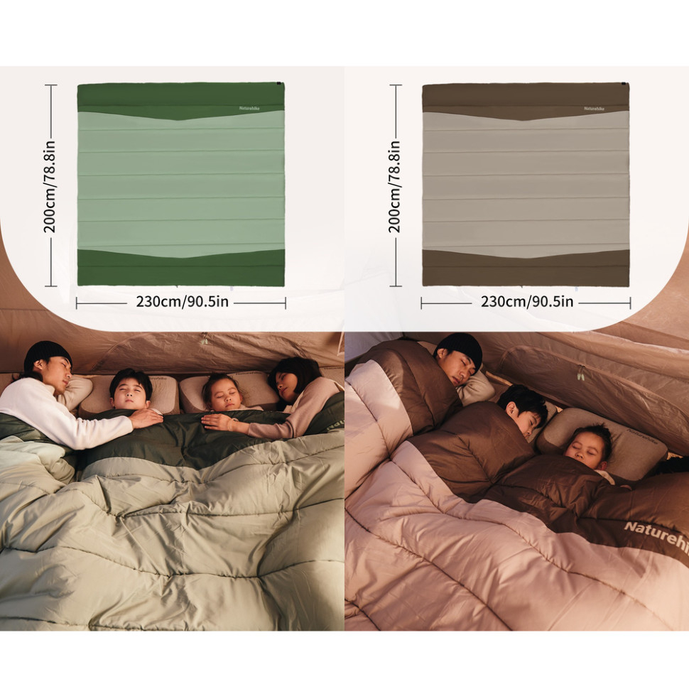 Спальний мішок Naturehike CNK2300019 є актуальним для подорожей з сім'єю або друзями у міжсезоння. Модель розрахована на використання за температури від 2 до 7°C, а універсальні розміри 200 х 115 см дозволяють вільно розміститися вдвох.