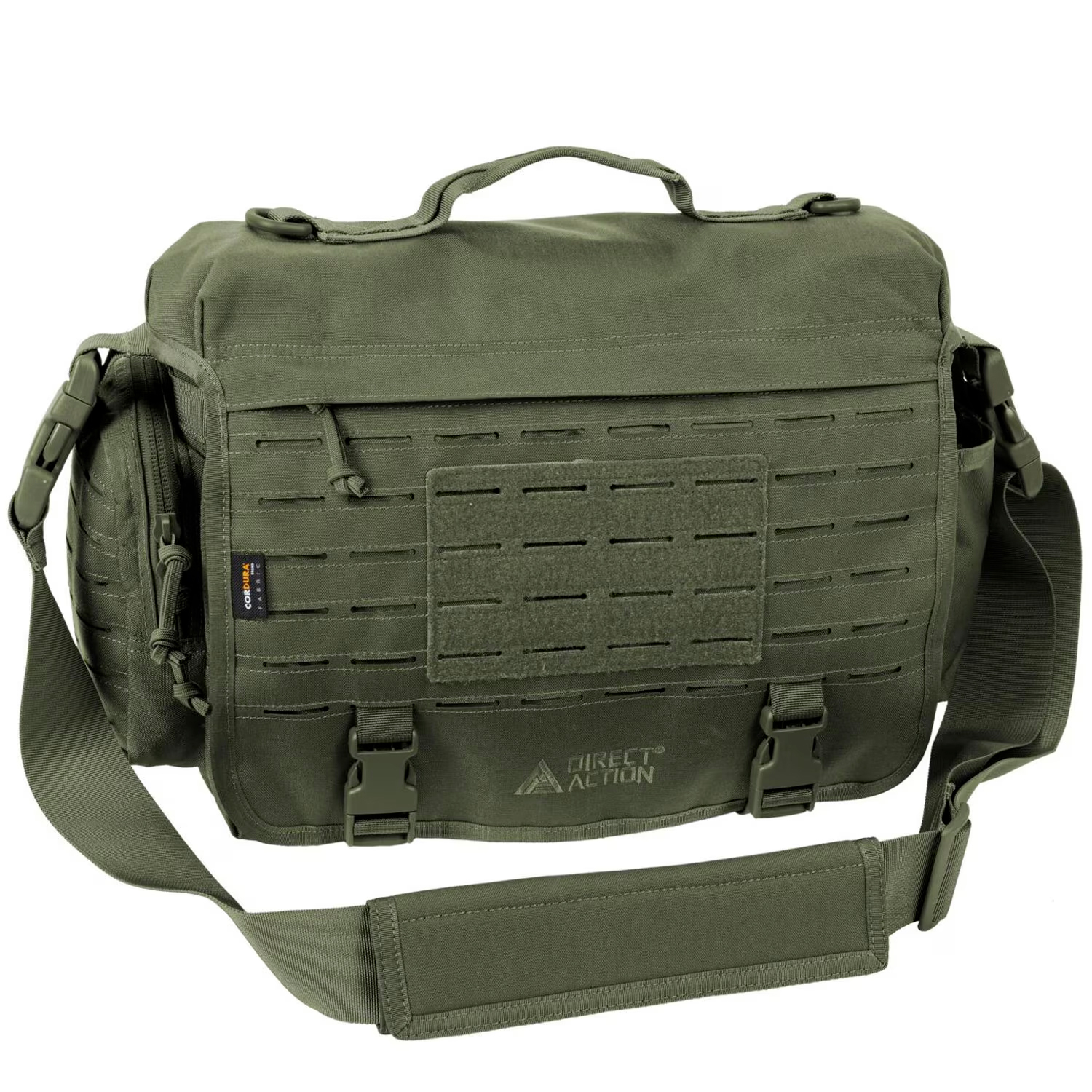 Сумка Direct Action Messenger 10 л Olive GreenСумка Direct Action Messenger 10 л від польського бренду Direct Action – це легка та універсальна тактична сумка, ідеальна для повсякденного носіння, тактичних операцій, тренувань чи подорожей. Виготовлена з міцного нейлону Cordura 500D із водостійким покриттям DWR, вона забезпечує надійність і захист від несприятливих погодних умов. Сумка оснащена основним відділенням із Velcro-панелями для індивідуальної організації вмісту, наприклад, кріплення кобури чи підсумків. М’яка кишеня всередині головного відділення захищає ноутбук або планшет до 13 дюймів. Сумка має велику кількість кишень: прозорий вініловий карман на внутрішній стороні клапана, плоску кишеню на блискавці зовні, дві передні кишені з органайзерами, дві бічні кишені та задню кишеню. Лазерно вирізана система MOLLE/PALS дозволяє кріпити додаткове спорядження. Регульований плечовий ремінь із нековзною подушкою та знімний поясний ремінь забезпечують комфорт під час тривалого використання. Еластичний шнур унизу дозволяє переносити одяг зовні, а зручна ручка полегшує транспортування.