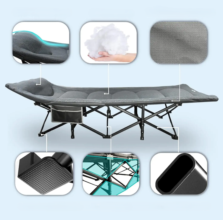 Міцна конструкція: металевий каркас гарантує довговічність і стійкість.Міцна конструкція:Компактність: у складеному вигляді займає мінімум місця та зручна для транспортування.Компактність:Легкість: невелика вага дозволяє легко переносити розкладачку.Легкість:Комфортне спальне місце: підходить для повноцінного відпочинку поза домом.Комфортне спальне місце:Матеріали: зносостійке полотно, стійке до навантажень і зовнішніх умов.Матеріали:Переваги: