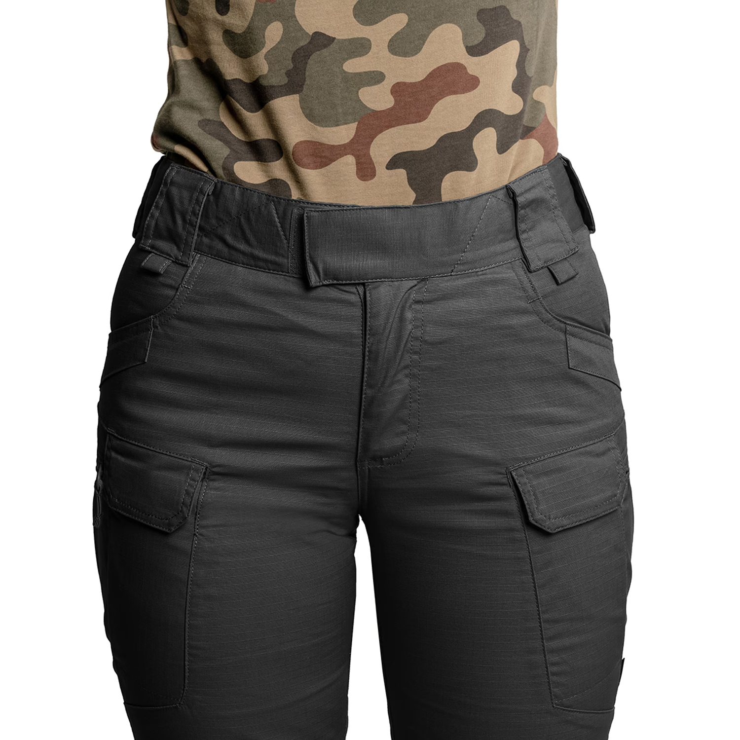 Жіночі штани Helikon Women's UTP Resized PolyCotton Rip-Stop - BlackЖіночі штани Helikon Women's UTP Resized PolyCotton Rip-Stop у кольорі Black – це тактична модель із серії Urban Tactical Pants від польського бренду Helikon-Tex, адаптована для жінок. Виготовлені з міцної тканини PolyCotton RipStop (60% бавовна, 37% поліестер, 3% еластан), що забезпечує стійкість до стирання та розривів, а також додає еластичності для свободи рухів. Версія Resized має покращений крій, який ідеально облягає жіночу фігуру, забезпечуючи комфорт під час активного відпочинку, польових операцій чи повсякденного носіння в міських умовах. Штани оснащені 12 кишенями, включно з двома прихованими в поясі, для зручного розміщення спорядження. Широкі шльовки (до 50 мм) сумісні з тактичними ременями, а еластичний пояс із застібкою на Velcro дозволяє регулювати посадку. Посилені краї кишень витримують навантаження від кліпс ліхтариків чи ножів.