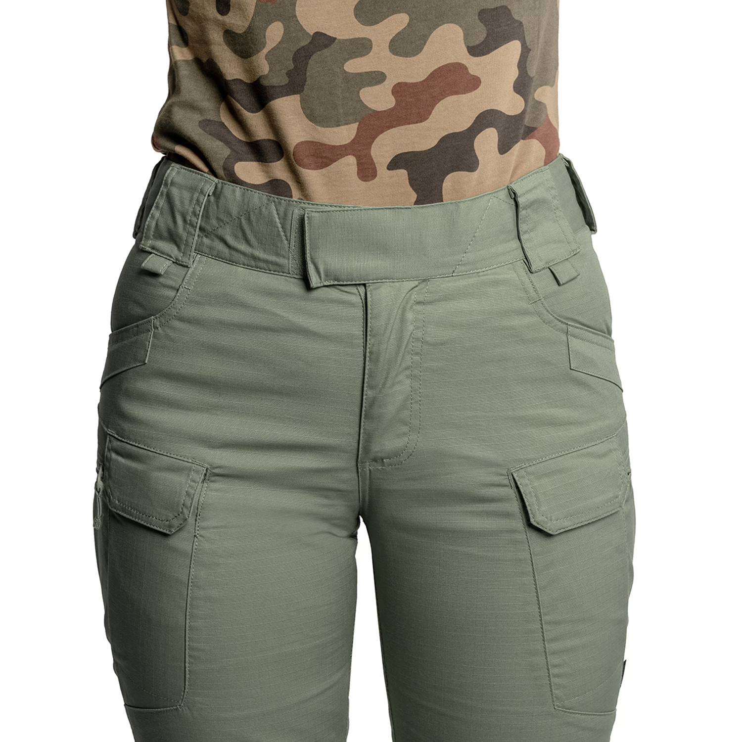 Жіночі штани Helikon Women's UTP Resized PolyCotton Rip-Stop -Жіночі штани Helikon Women's UTP Resized PolyCotton Rip-Stop у кольорі Olive Drab– це тактична модель із серії Urban Tactical Pants від польського бренду Helikon-Tex, адаптована для жінок. Виготовлені з міцної тканини PolyCotton RipStop (60% бавовна, 37% поліестер, 3% еластан), що забезпечує стійкість до стирання та розривів, а також додає еластичності для свободи рухів. Версія Resized має покращений крій, який ідеально облягає жіночу фігуру, забезпечуючи комфорт під час активного відпочинку, польових операцій чи повсякденного носіння в міських умовах. Штани оснащені 12 кишенями, включно з двома прихованими в поясі, для зручного розміщення спорядження. Широкі шльовки (до 50 мм) сумісні з тактичними ременями, а еластичний пояс із застібкою на Velcro дозволяє регулювати посадку. Посилені краї кишень витримують навантаження від кліпс ліхтариків чи ножів.